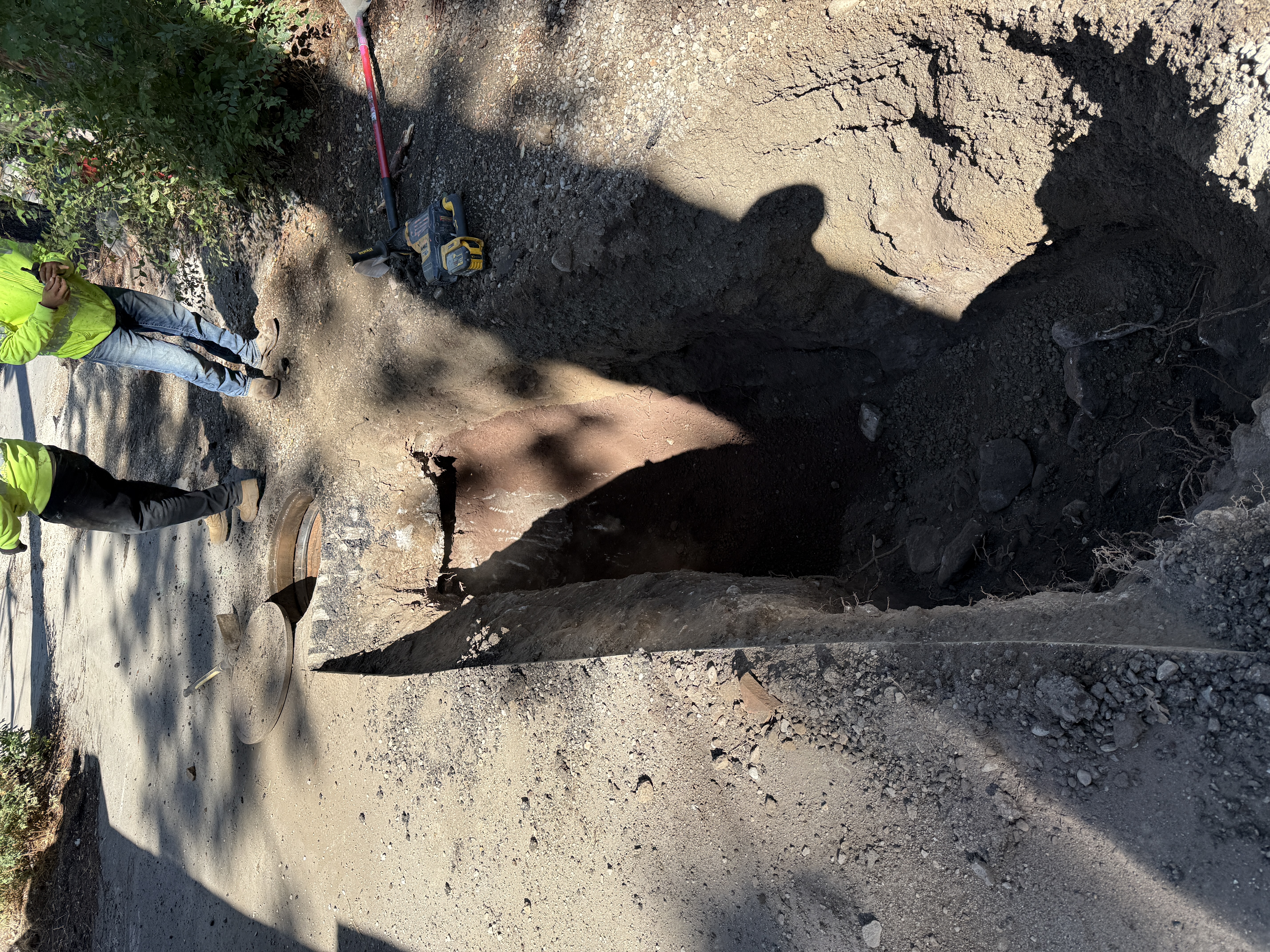 The image shows an open trench with two workers standing next to it, likely involved in trenching or inspection activities. The trench is directly adjacent to a manhole access point which is partially opened. A few tools are scattered near the trench, but no heavy equipment is present. The workers are wearing protective clothing including hi-vis vests.