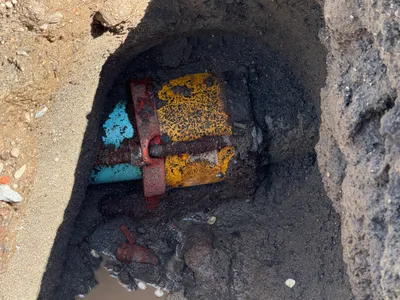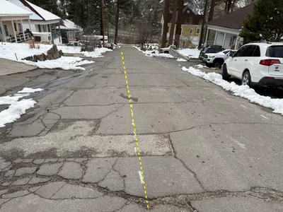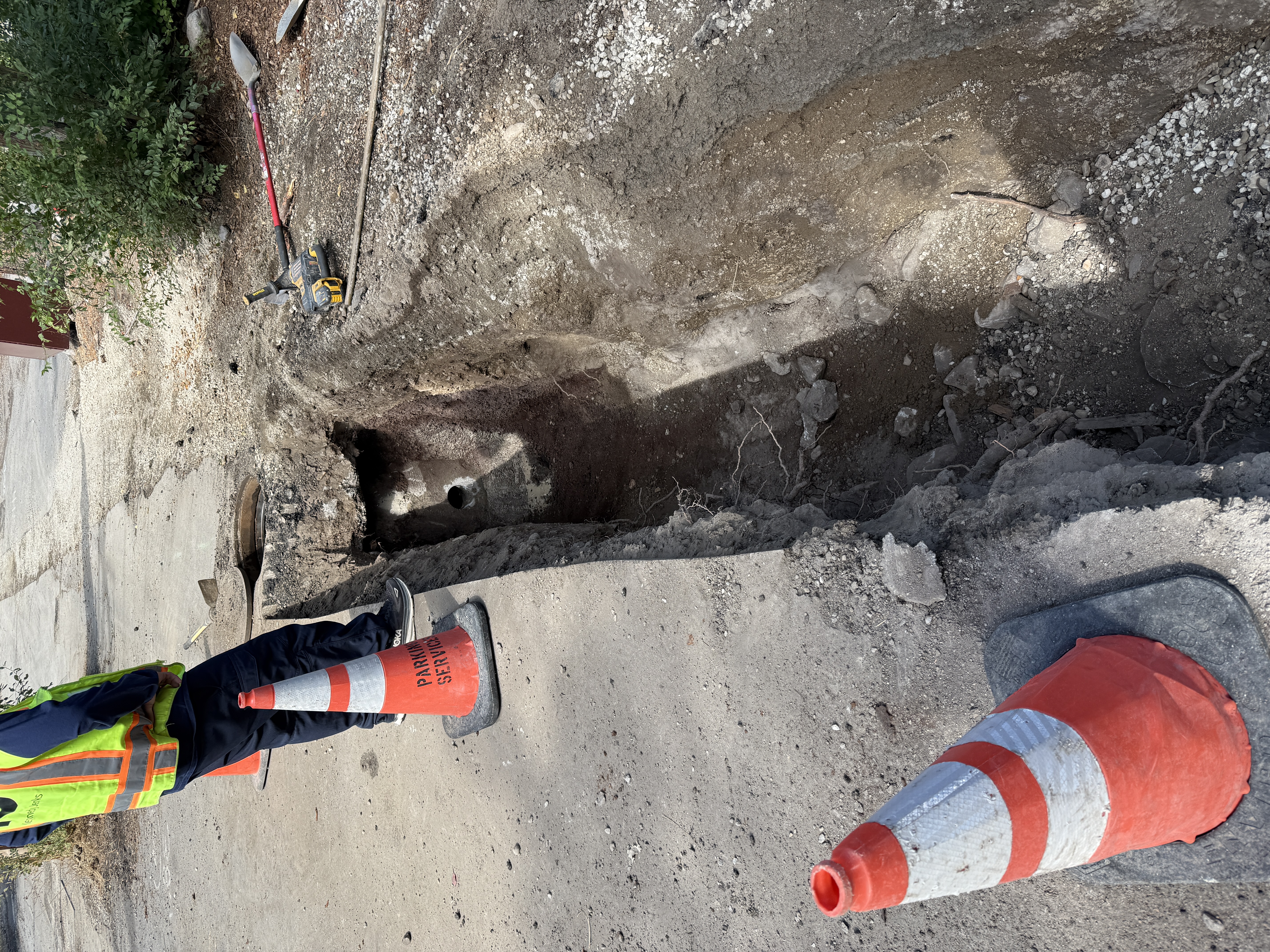 exposed soil and pavement with open trench clear daylight conditions congested access due to trench