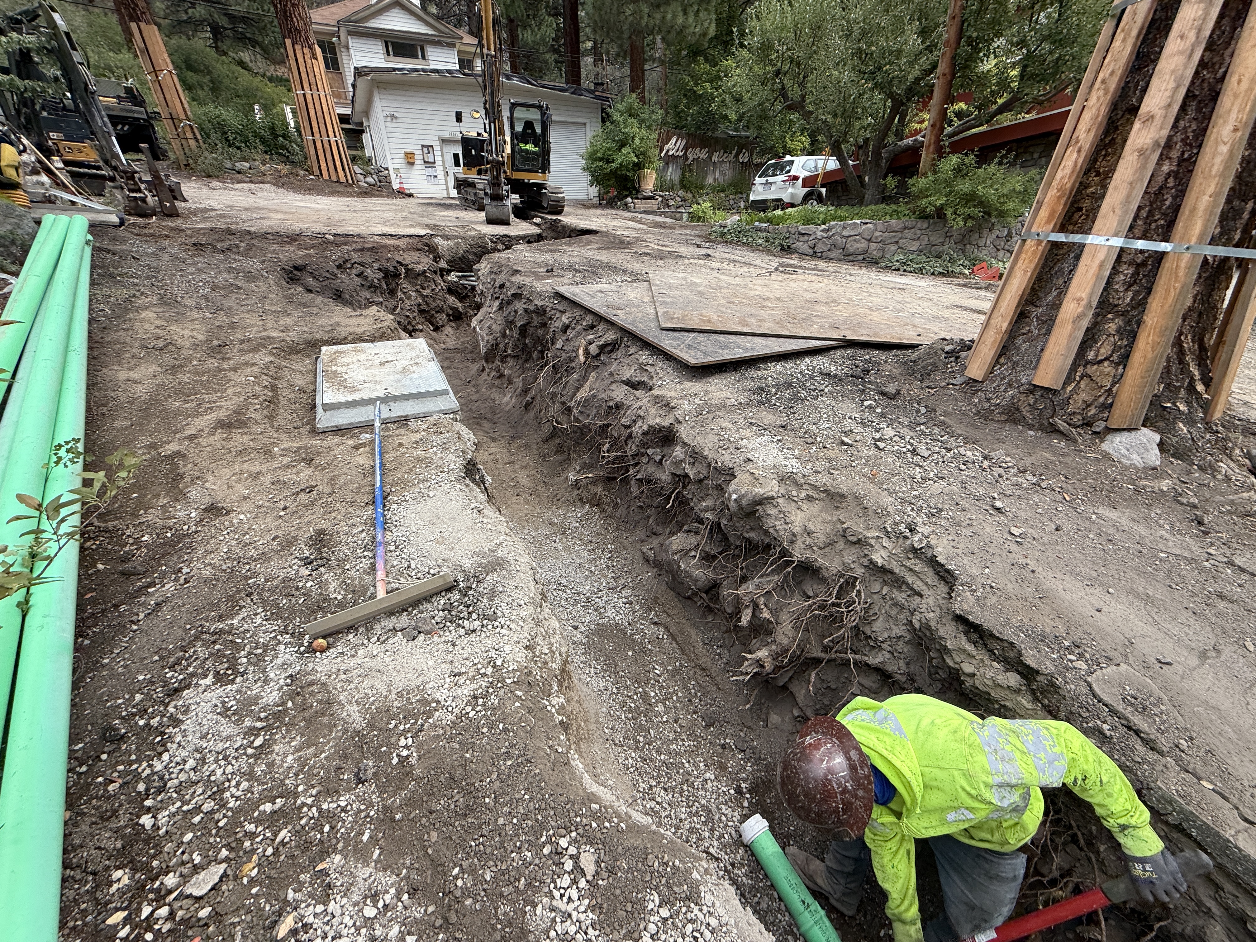 The image shows a worker in a trench wearing a hard hat and hi-vis clothing, performing trenching activities. Green pipes are placed along the trench, and excavation is taking place with the help of a mini excavator. A residential building is in the background with trees braced with wooden supports. An open trench is visible with uneven ground surrounding it.