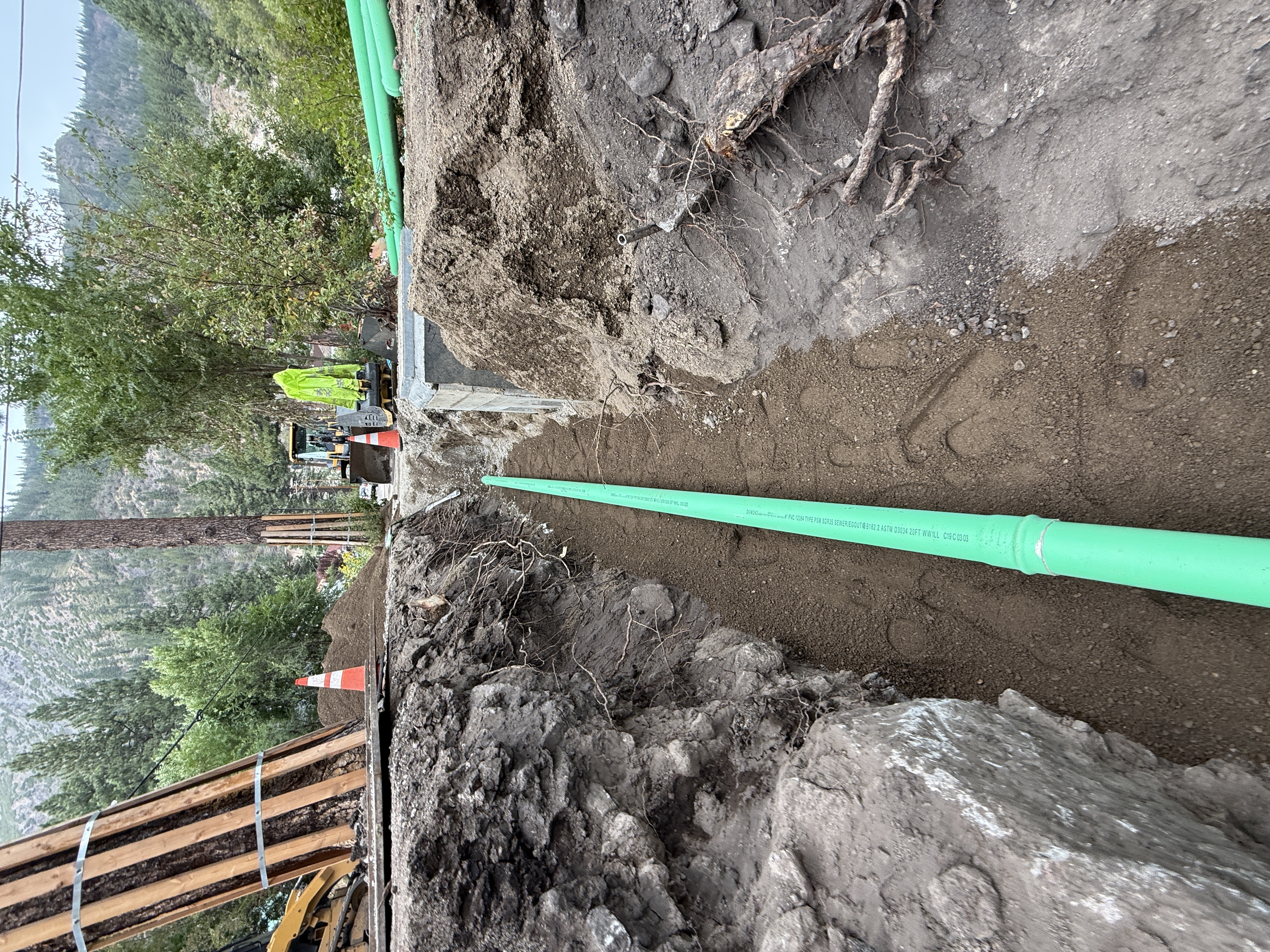 The image shows an open trench with a green pipeline laid along its length, suggesting pipeline installation work. In the background, a construction vehicle is seen along with safety cones and a bright jacket on the equipment. The trench and pipeline appear to be part of sanitary sewer work.