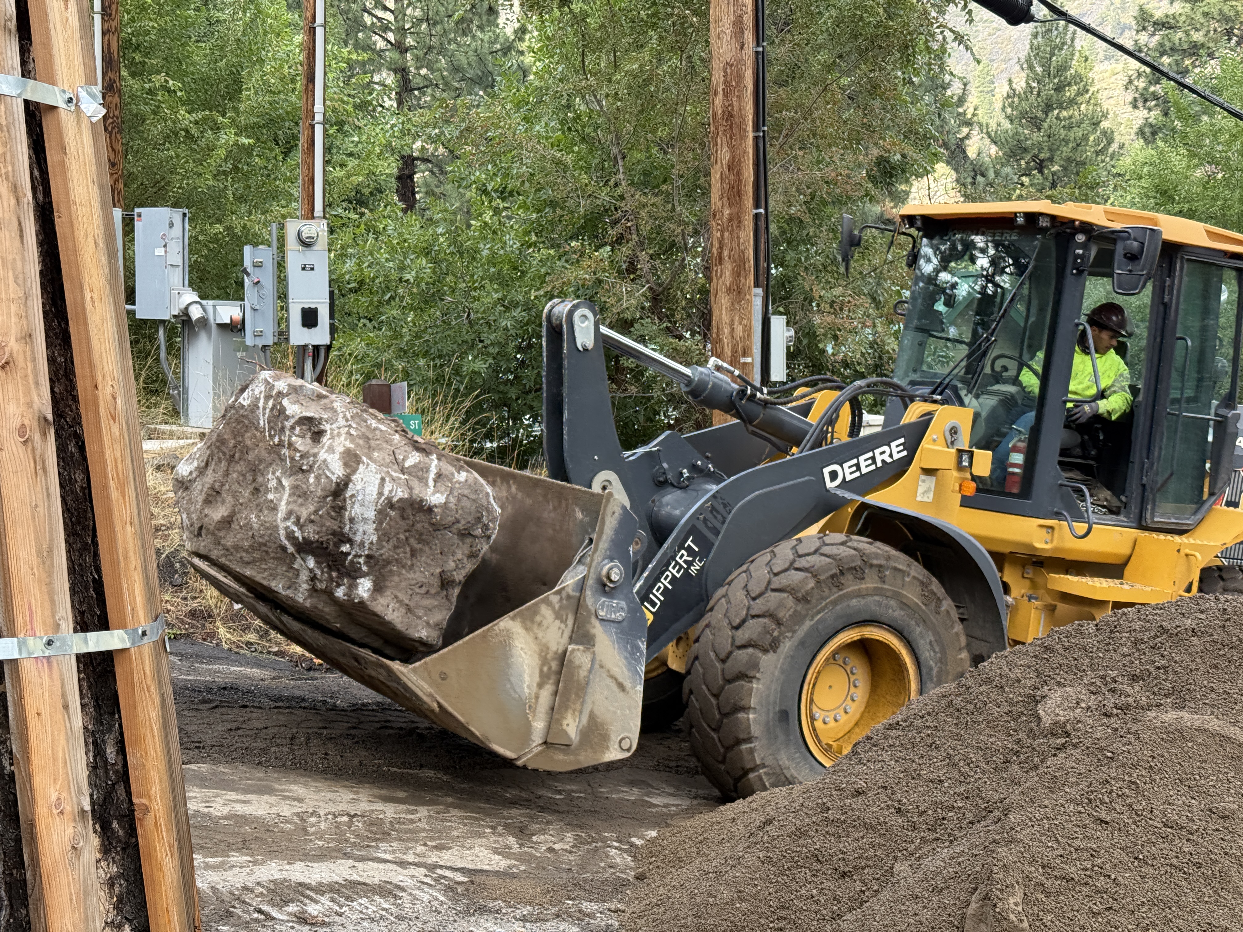 A front loader, operated by a worker, is moving a large rock across a dirt area. The loader has a load of soil and is positioned near utility poles and electrical panels. The setting is an outdoor construction area with trees and utility infrastructure present. The worker is equipped with standard safety gear.