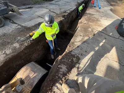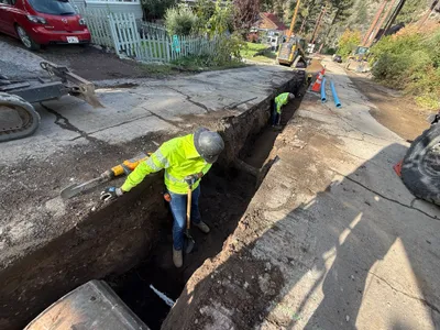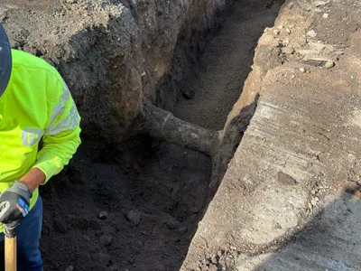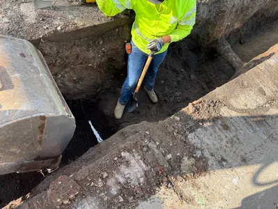 A worker wearing safety PPE is standing in a trench, appearing to be involved in trenching work. Several construction cones are placed near the open trench, and an excavator is visible nearby. The area shows signs of active excavation, with disturbed soil and trench walls. A structure is in the background with notes or permits on the door. Green labeled tape lies on the bottom of the trench.