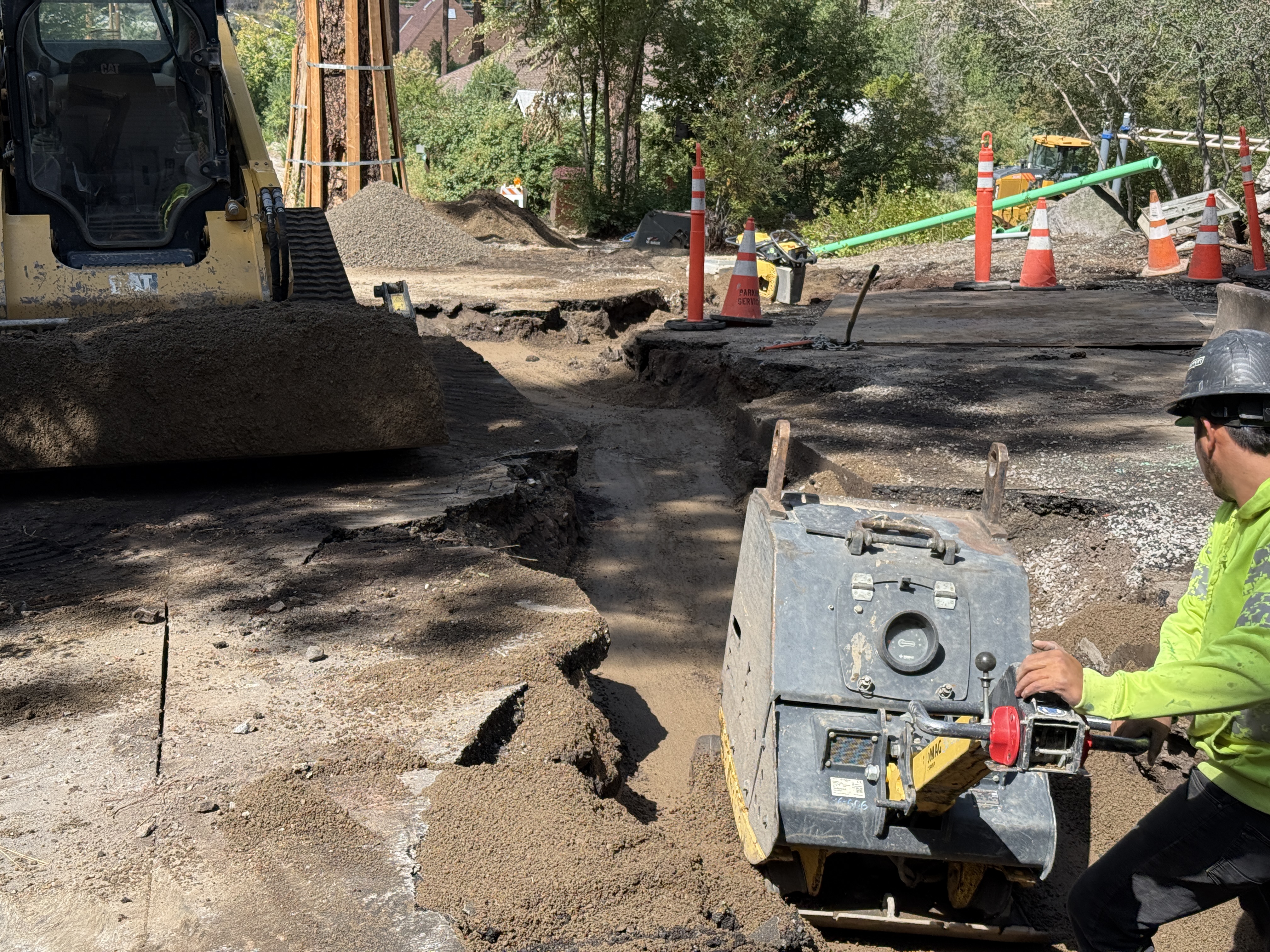 A worker is operating a compactor on a section of disturbed earth or trench. Traffic cones and other construction equipment are visible in the background. The area appears to be undergoing soil compaction, likely after trenching or excavation. There is an uneven surface with visible trench lines.