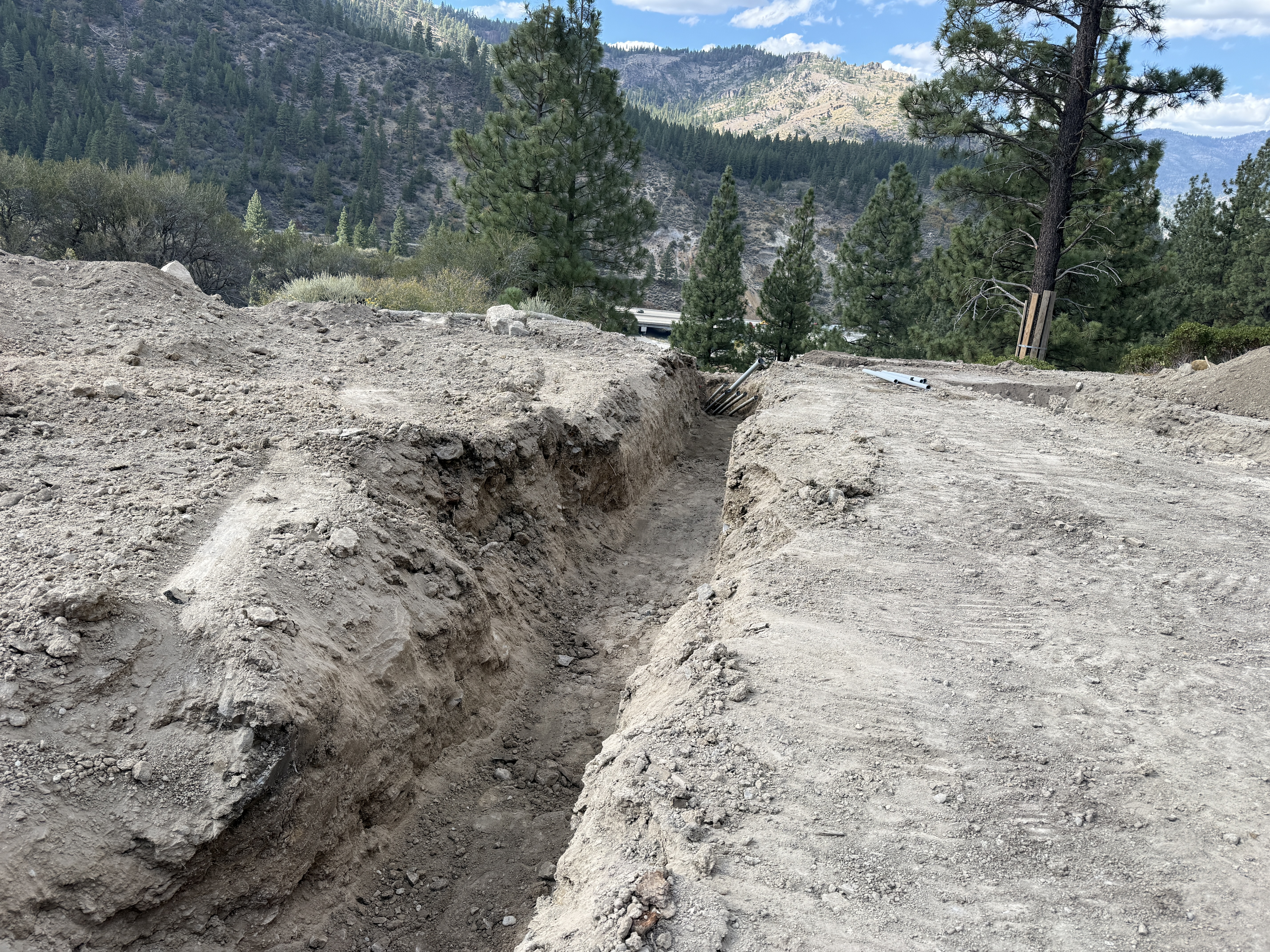 The image shows a trench that has been excavated through a dirt area, surrounded by trees and a mountainous background. The trench appears to run in a straight line, suggesting preparation for potential utilities or groundwork. There are no workers or machinery present in the image, and the trench walls are distinct without visible support structures.