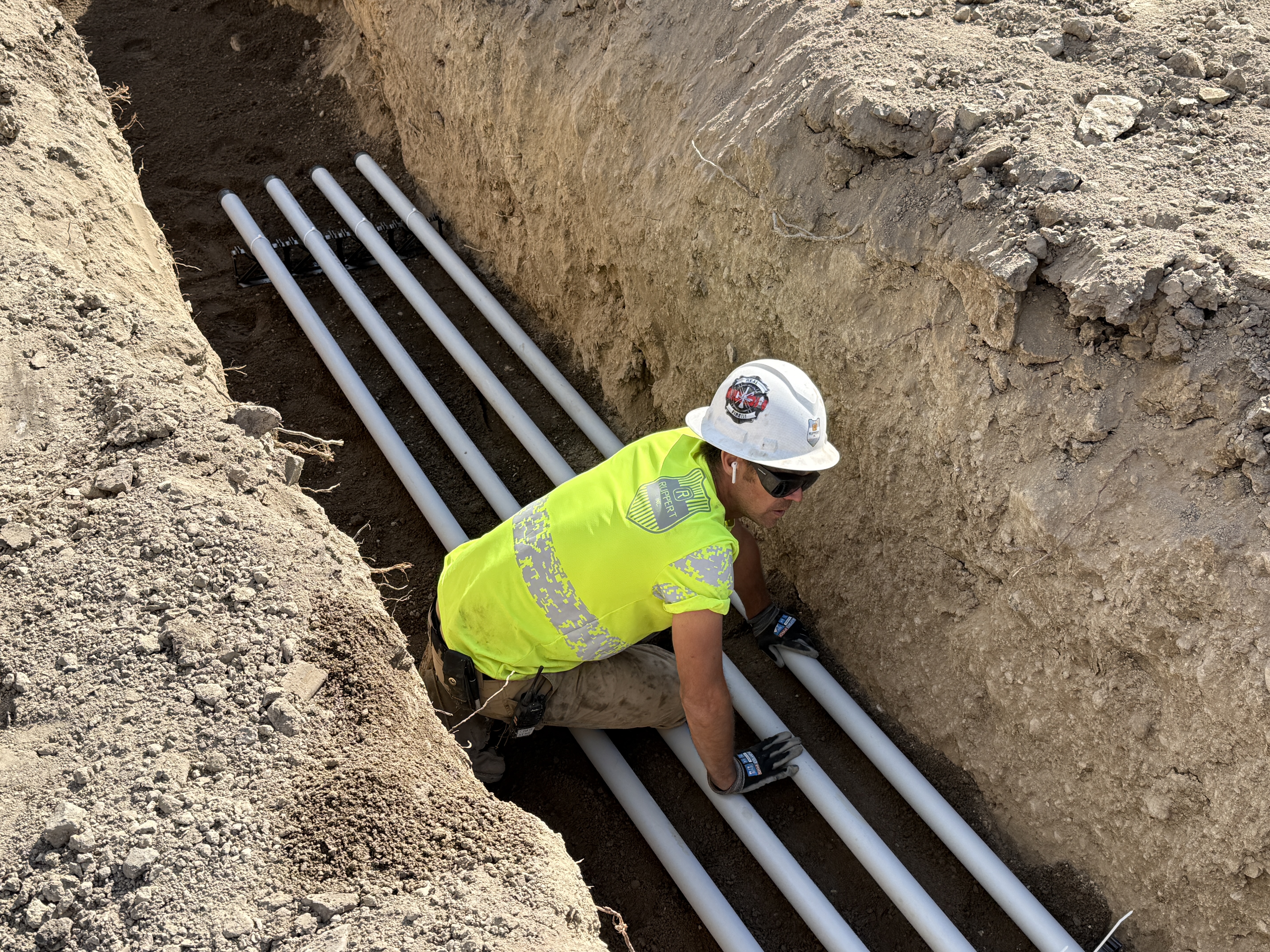 The image shows a worker in a trench arranging white conduit pipes. The worker is wearing a hard hat and a hi-vis vest. The pipes are aligned at the bottom of the trench, which is surrounded by soil. The worker appears to be adjusting or securing the pipes in place.