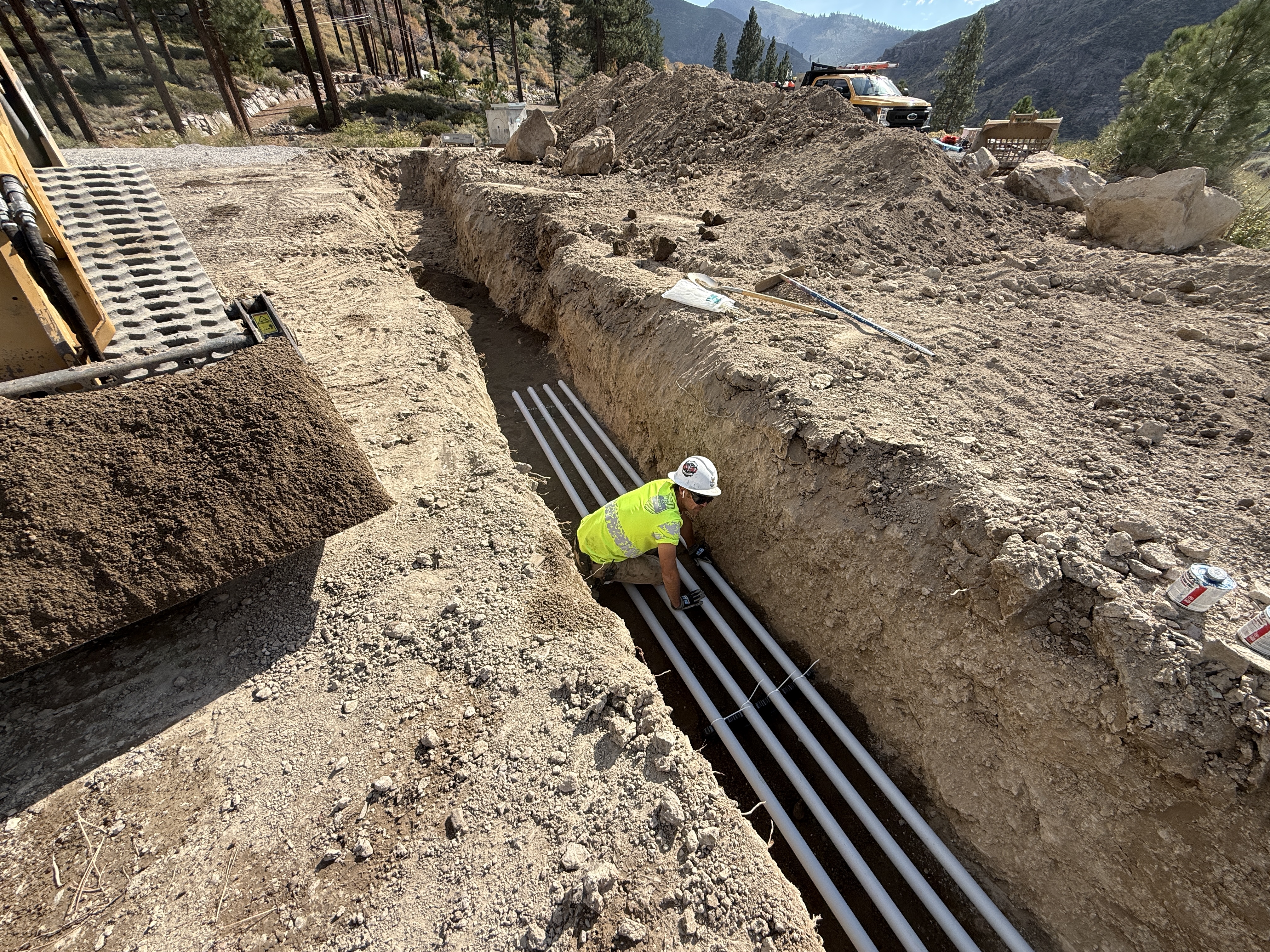 The image shows a trench with a worker positioning multiple conduits. The conduits are laid parallel within the trench. A construction vehicle is positioned at the edge of the trench. The surrounding area includes dirt piles and a truck parked nearby.