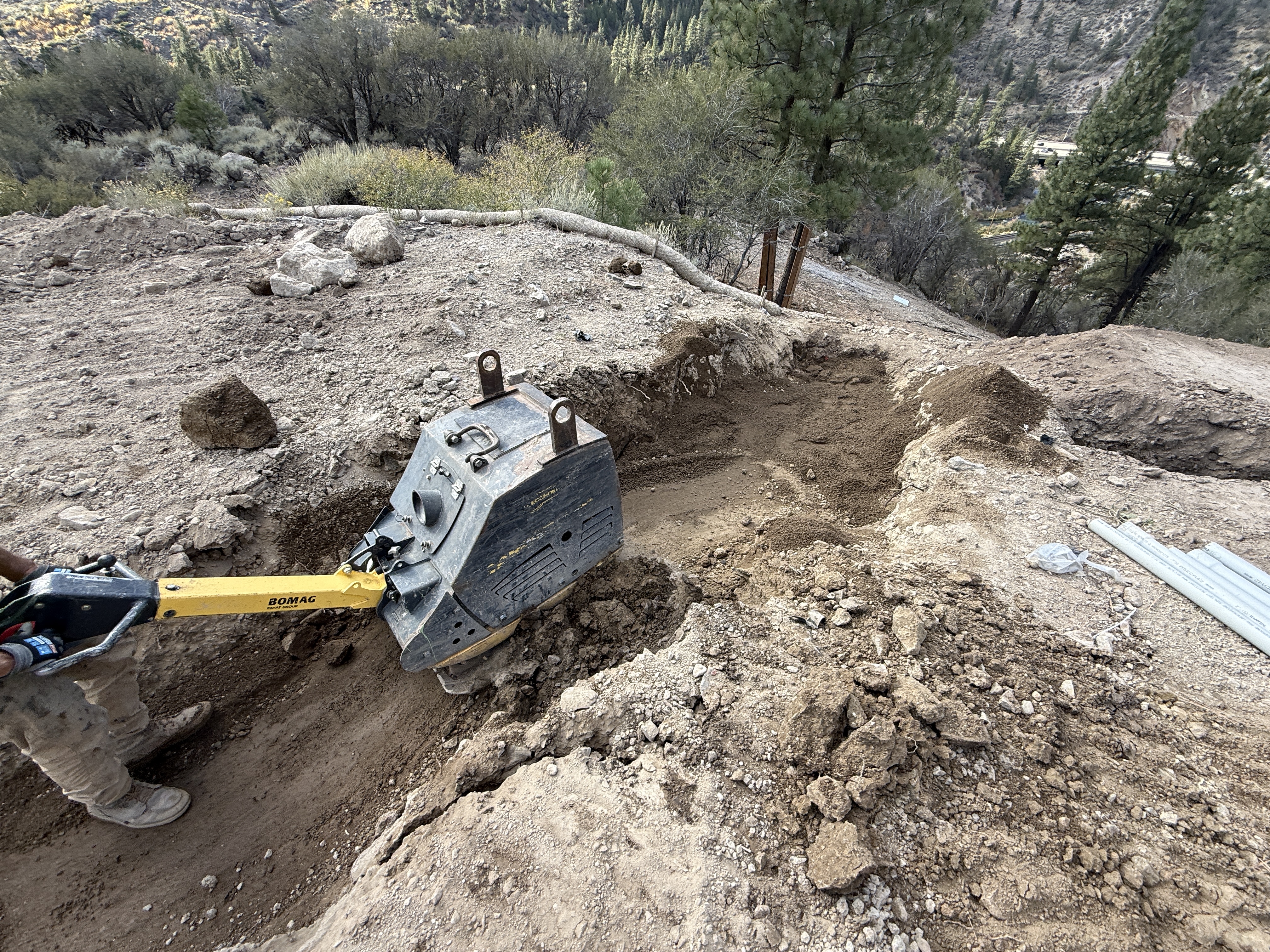 The image shows trenching work in progress with a compaction tool at the bottom of a partially excavated trench. The trench appears to be on a slope surrounded by natural vegetation. The soil around the trench is loose and unfinished. No other construction materials or machinery are visible in the immediate vicinity.