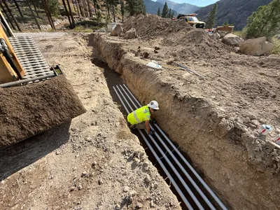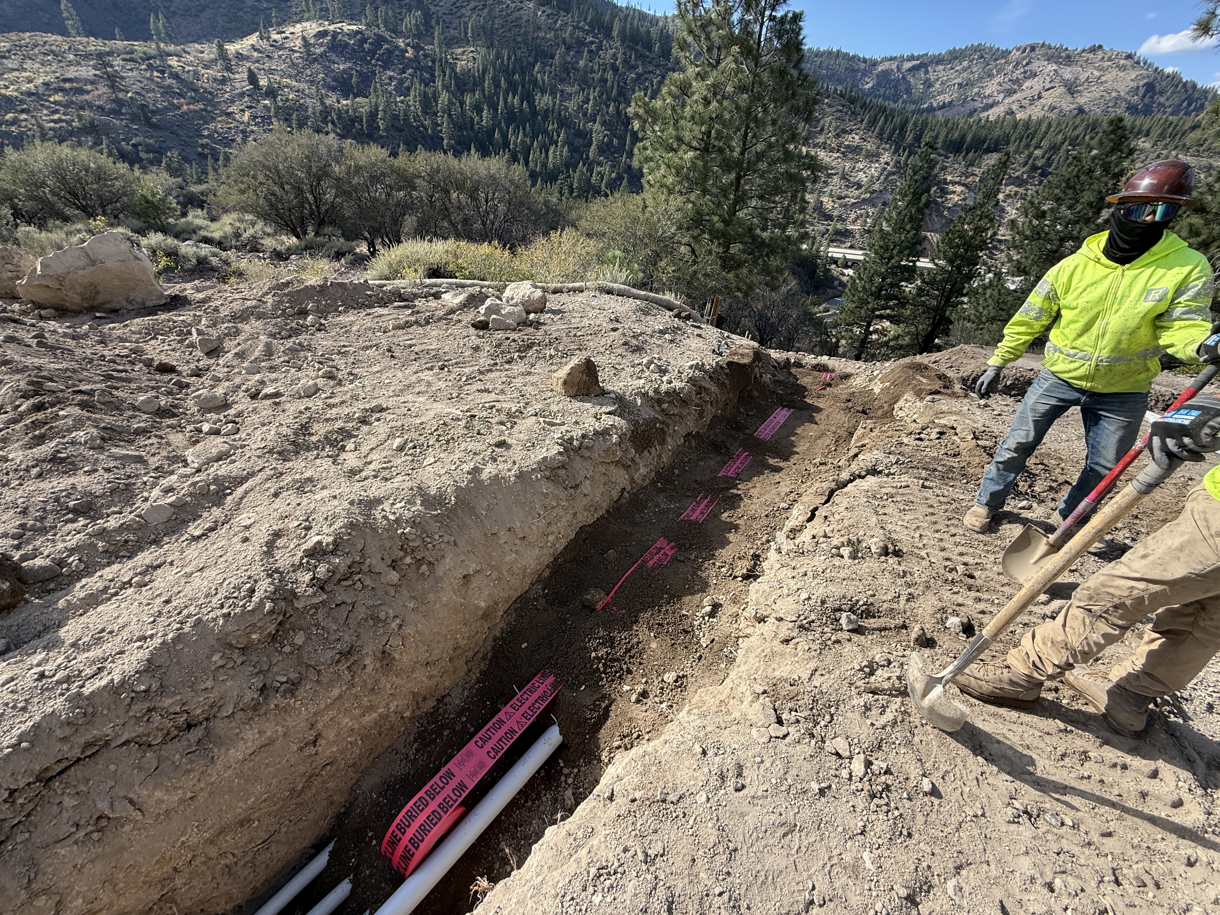 The image shows an open trench located in a mountainous area with PVC conduits installed at the bottom. Pink caution tape is placed over the conduits, indicating buried utilities. Two workers are visible; one is holding a shovel, wearing appropriate PPE such as hard hats and hi-vis jackets. The work area appears to be a duct bank construction site within the Floriston Filtration Project.