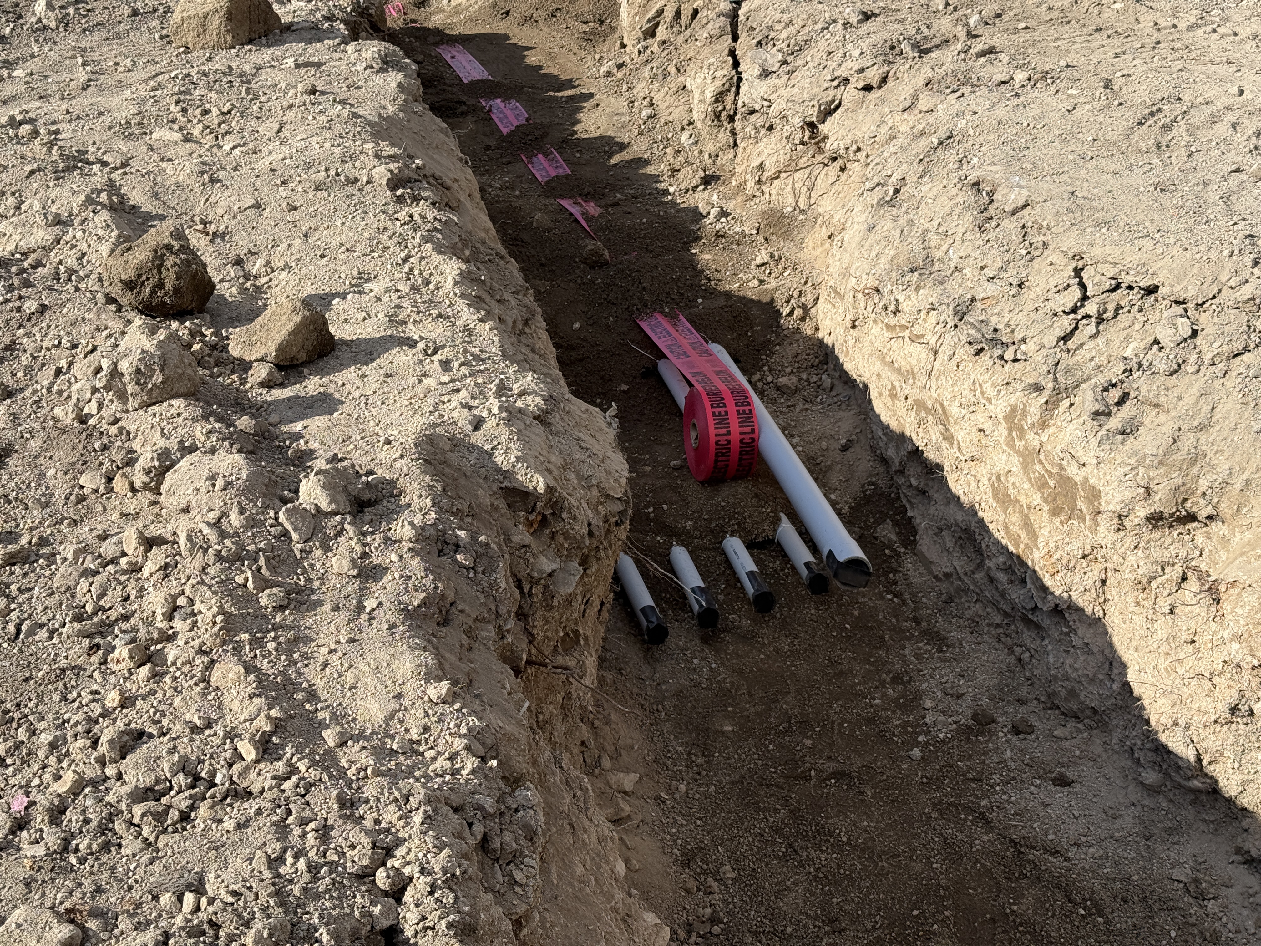 exposed soil with trench sunny with clear conditions appears clear for pipe staging