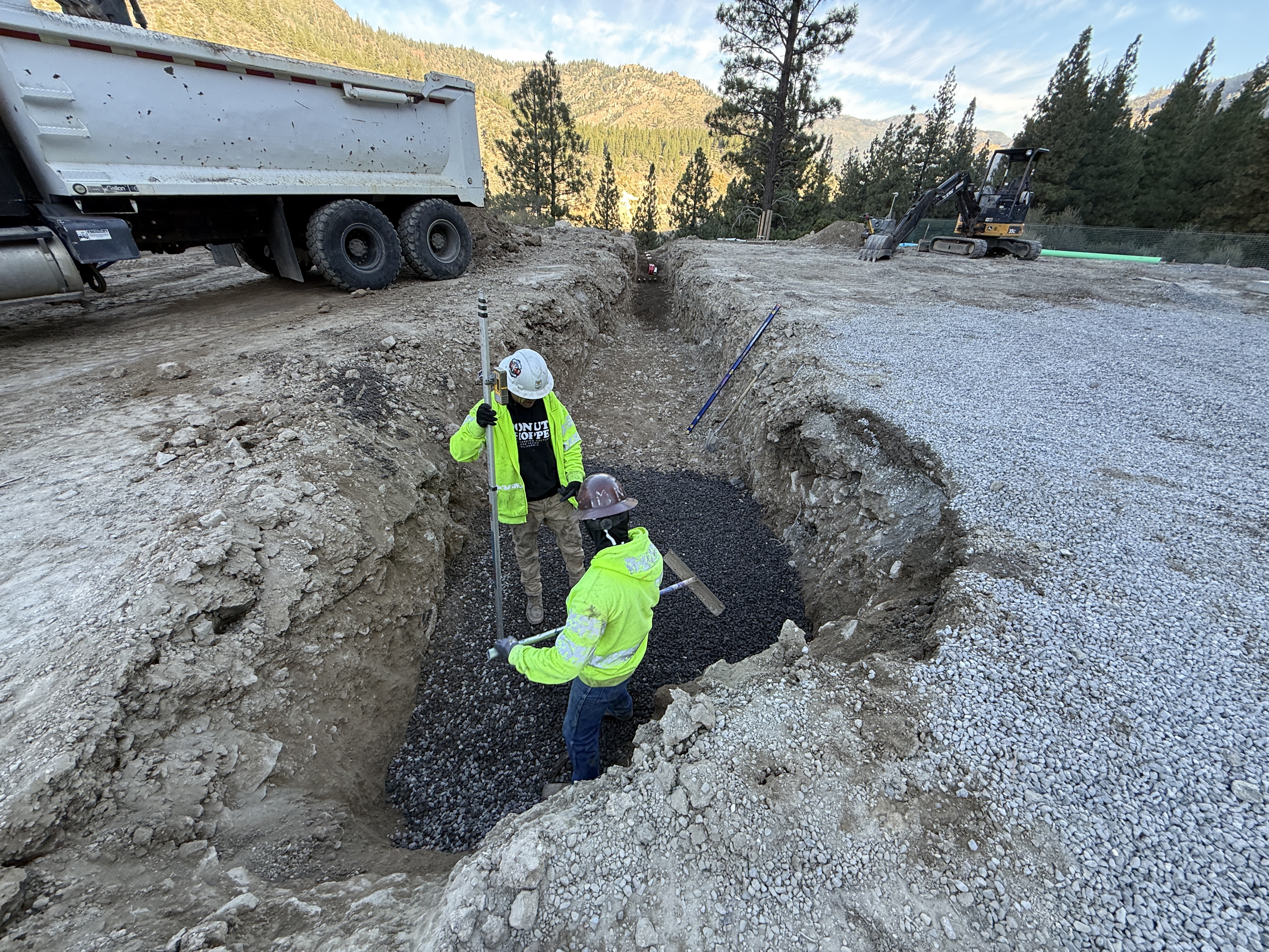 Two workers are standing in an open trench, using measuring tools. Gravel is partially filling the trench. A dump truck is on the left side, and a small excavator is on the upper right corner. The area is surrounded by trees and mountains, suggesting a remote location.