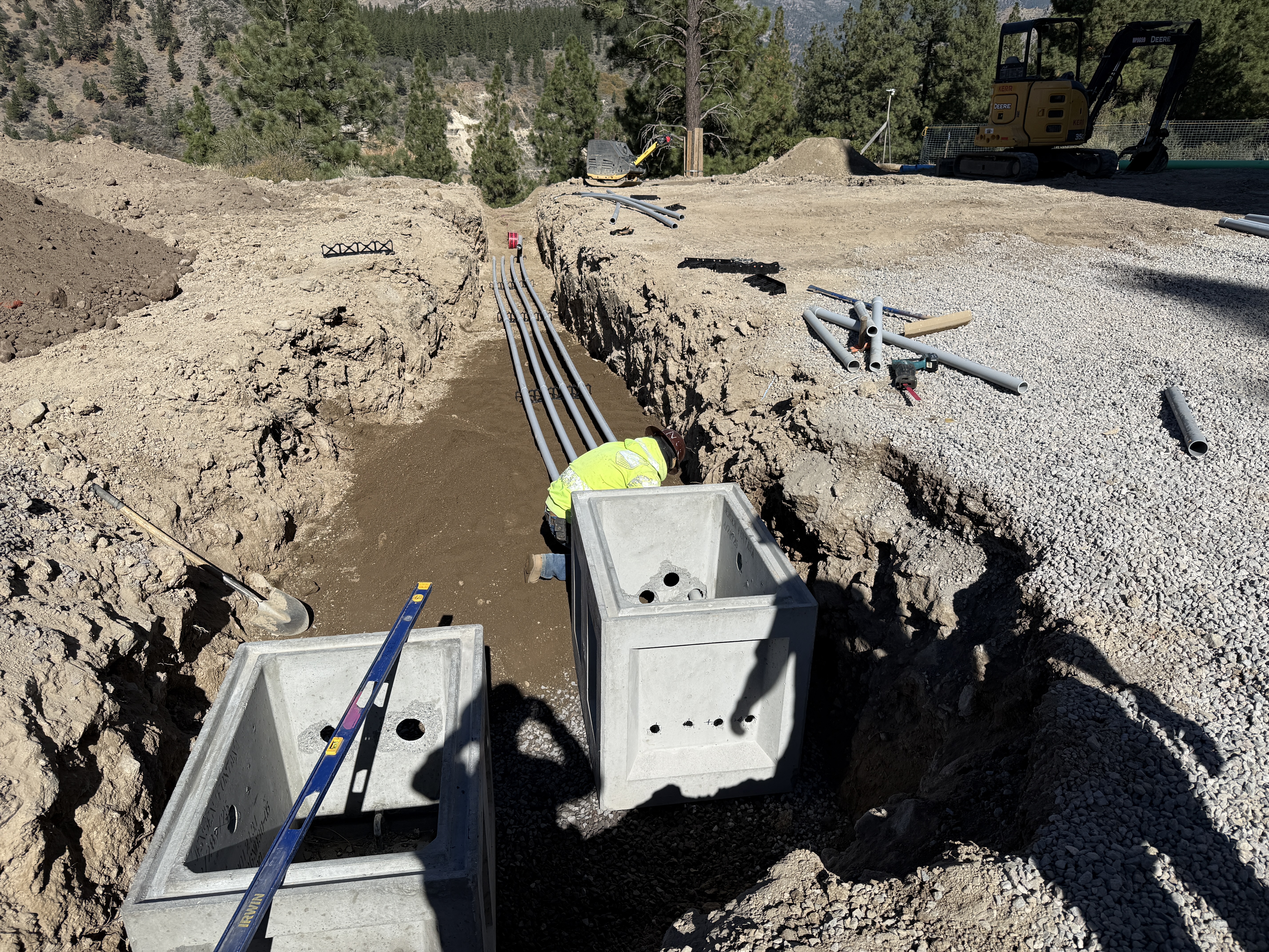 The image shows a trench with concrete vaults being installed, and conduits laid alongside. A worker, wearing safety gear, is inside the trench connecting or positioning components. A compact excavator is parked nearby, and the area is surrounded by trees and undisturbed natural terrain. The ground is primarily dirt with areas of gravel laid around.