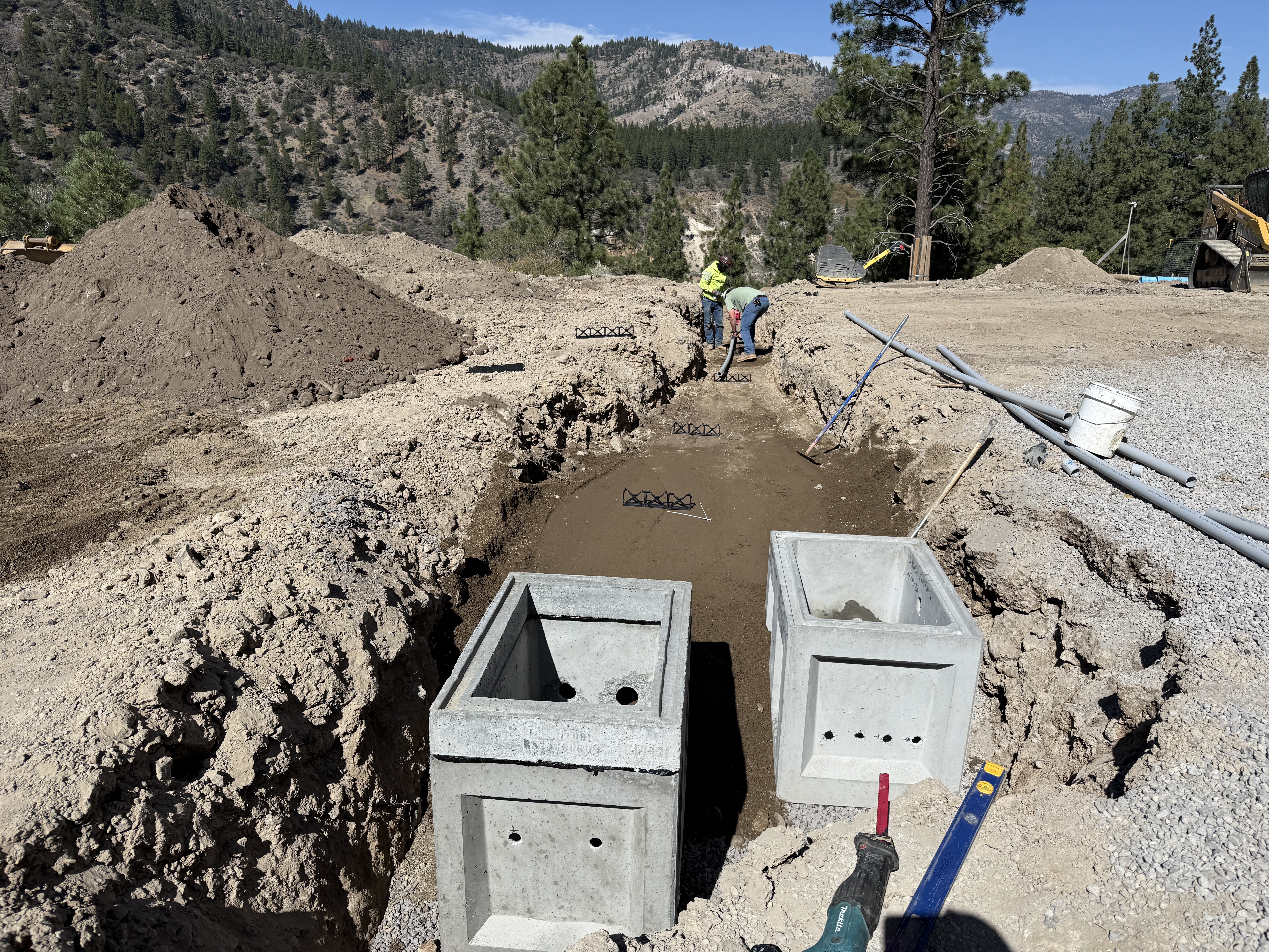 The image shows trenching work with two concrete structures placed near the trench. A worker is seen within the trench, suggesting ongoing trench preparation or installation activity. The area has earth mounds and visible excavation marks next to the trench. Construction equipment and manual tools like a level and a drill are present near the trench.