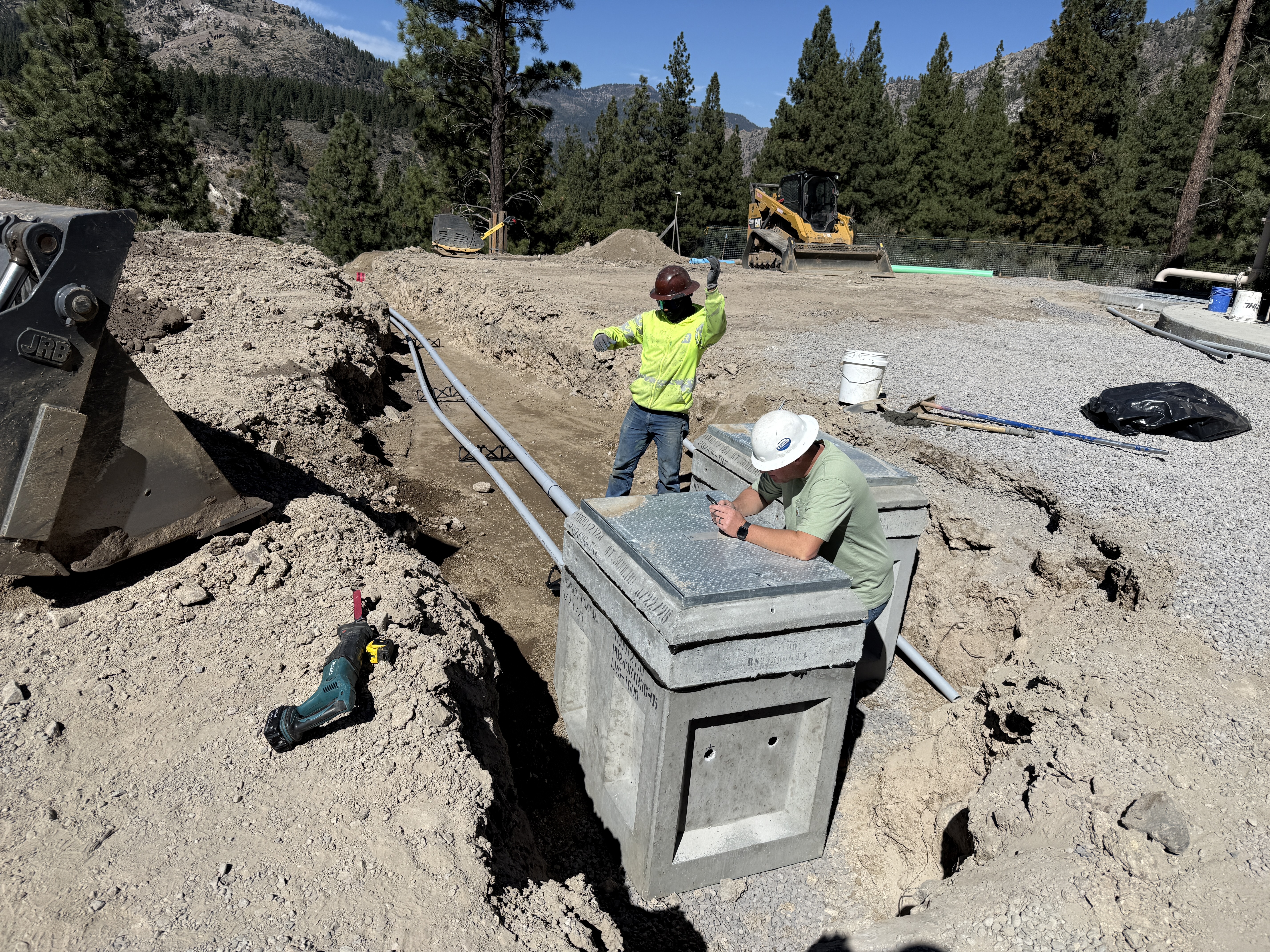 The image shows two workers at the trenching site. One is standing near a concrete utility vault, and the other is sitting on the vault. Conduits are being installed in a trench, which runs alongside the utility vaults. A skid-steer loader can be seen in the background, and the area appears to be in a forested region with trees and mountains.