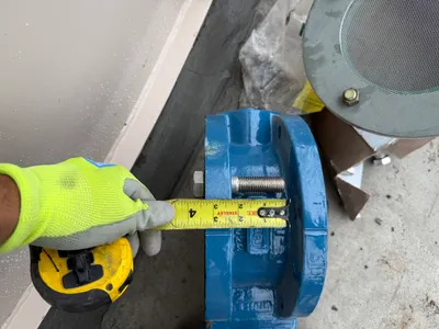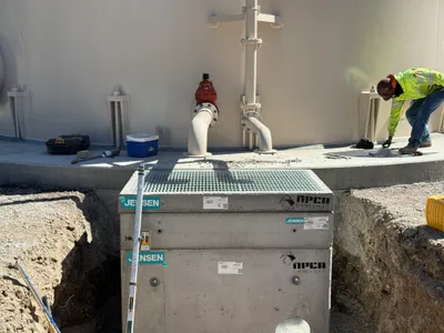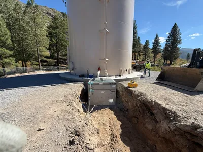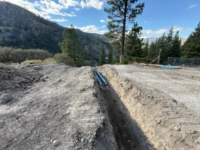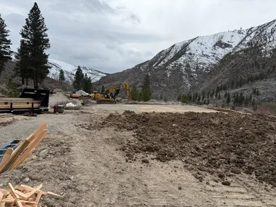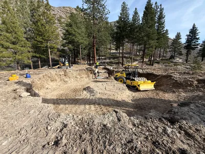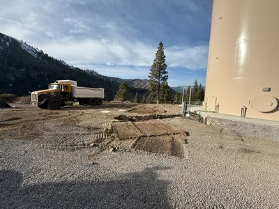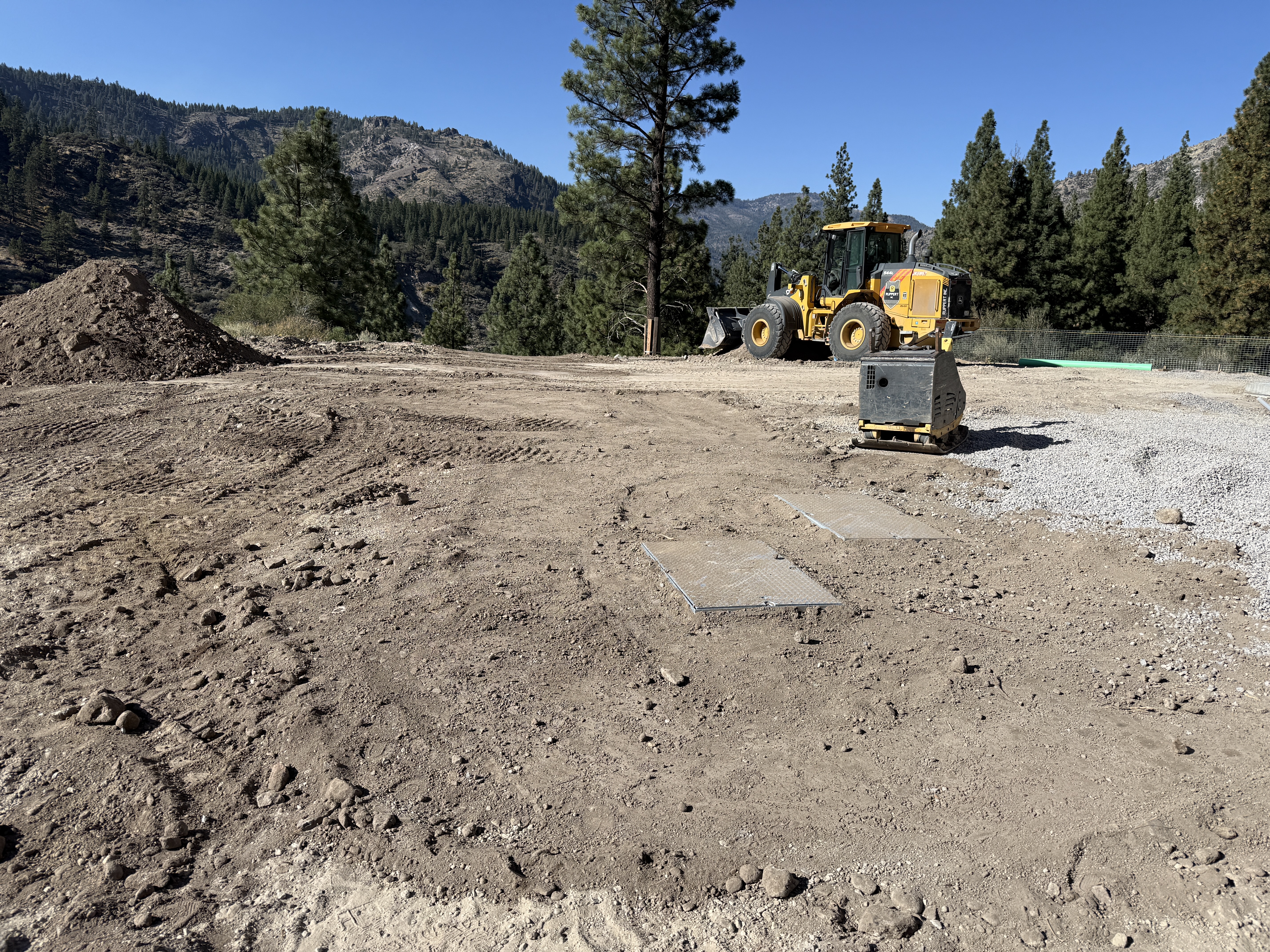 The image shows a construction site with a significant portion of the area leveled and graded. In the background, a large yellow loader is parked on the graded surface, suggesting ongoing site preparation. A pile of earth is visible on the left, while gravel is spread over parts of the surface on the right. Two metal covers lie on the ground, potentially indicating access points to covered utilities.
