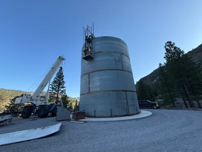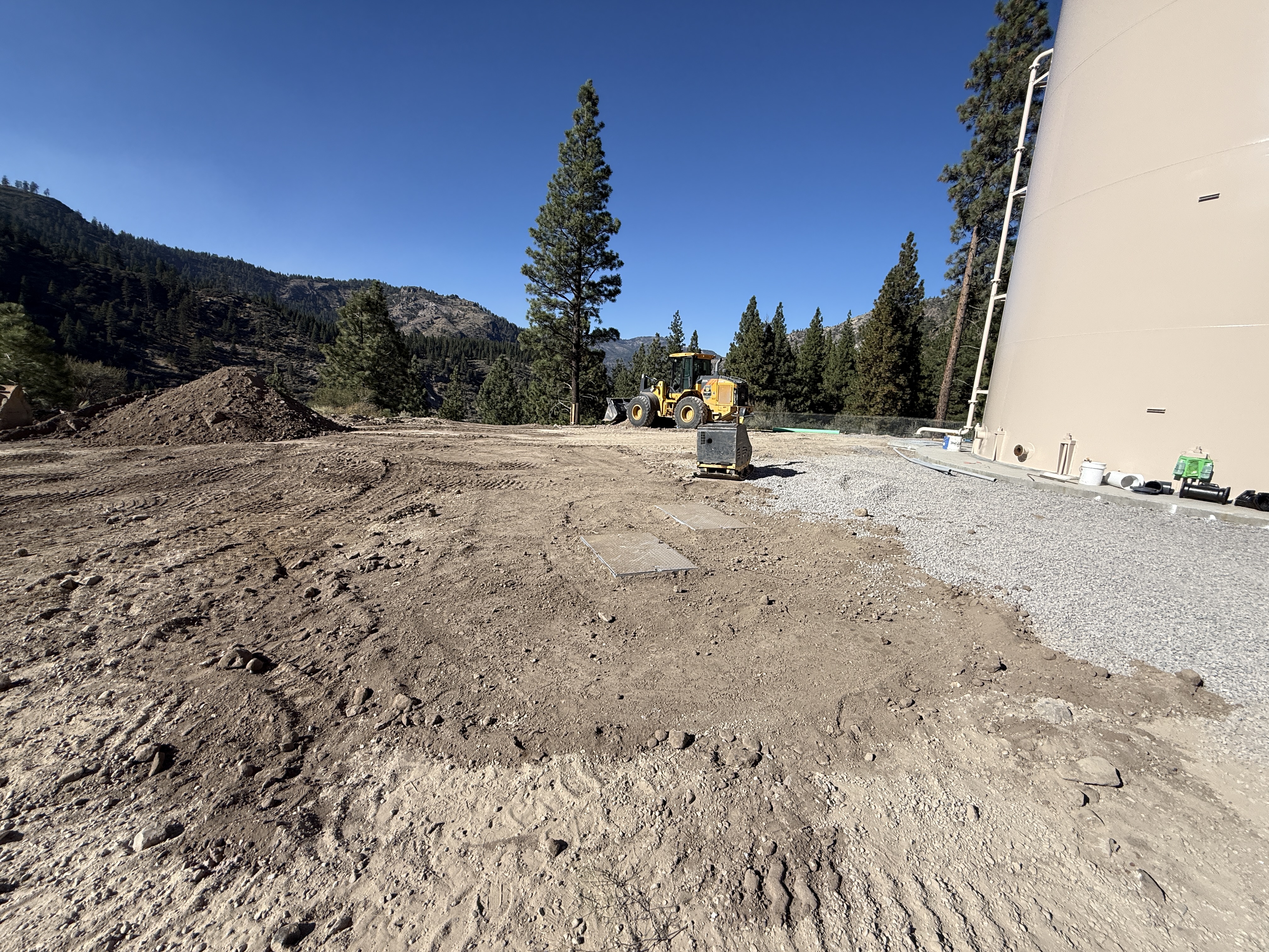 The image shows an area where site grading appears to be occurring, with visible soil disturbances and a large pile of dirt. A front loader and a compactor are positioned near a finished water tank on the right side. The environment includes several tall pine trees and a mountainous background. It is unclear if any specific construction activity is in progress.