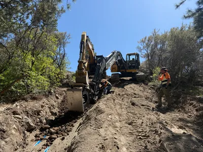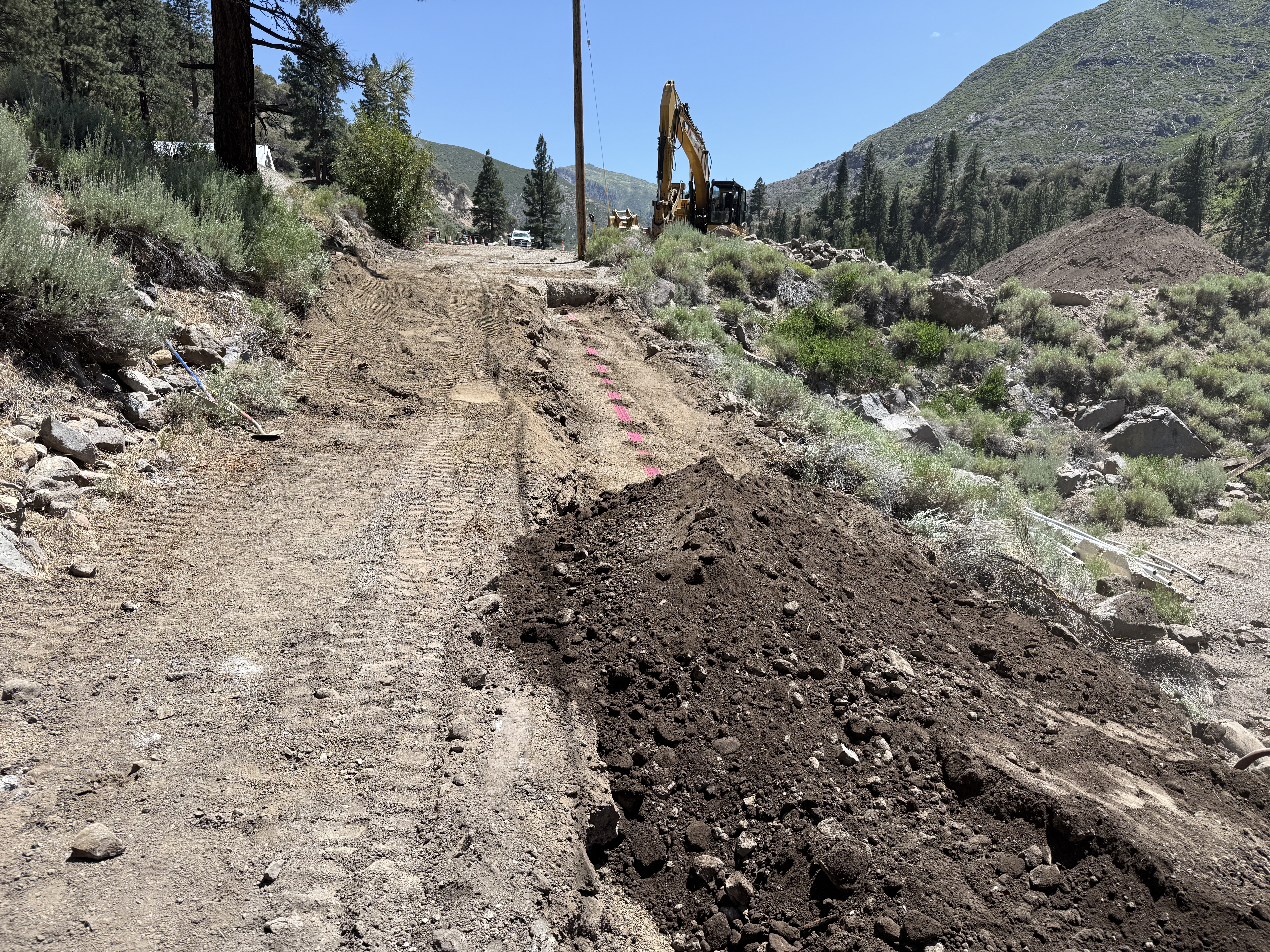 The image shows an excavated area on a dirt pathway with a large excavator positioned in the background. Tire tracks and mounds of earth are visible along the path. There is a shovel resting upright in the ground to the left. The area appears to be in a mountainous region with surrounding vegetation and a clear sky overhead. Some colored markings are visible on the ground near the excavation area.