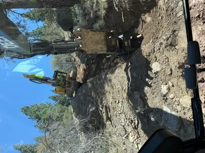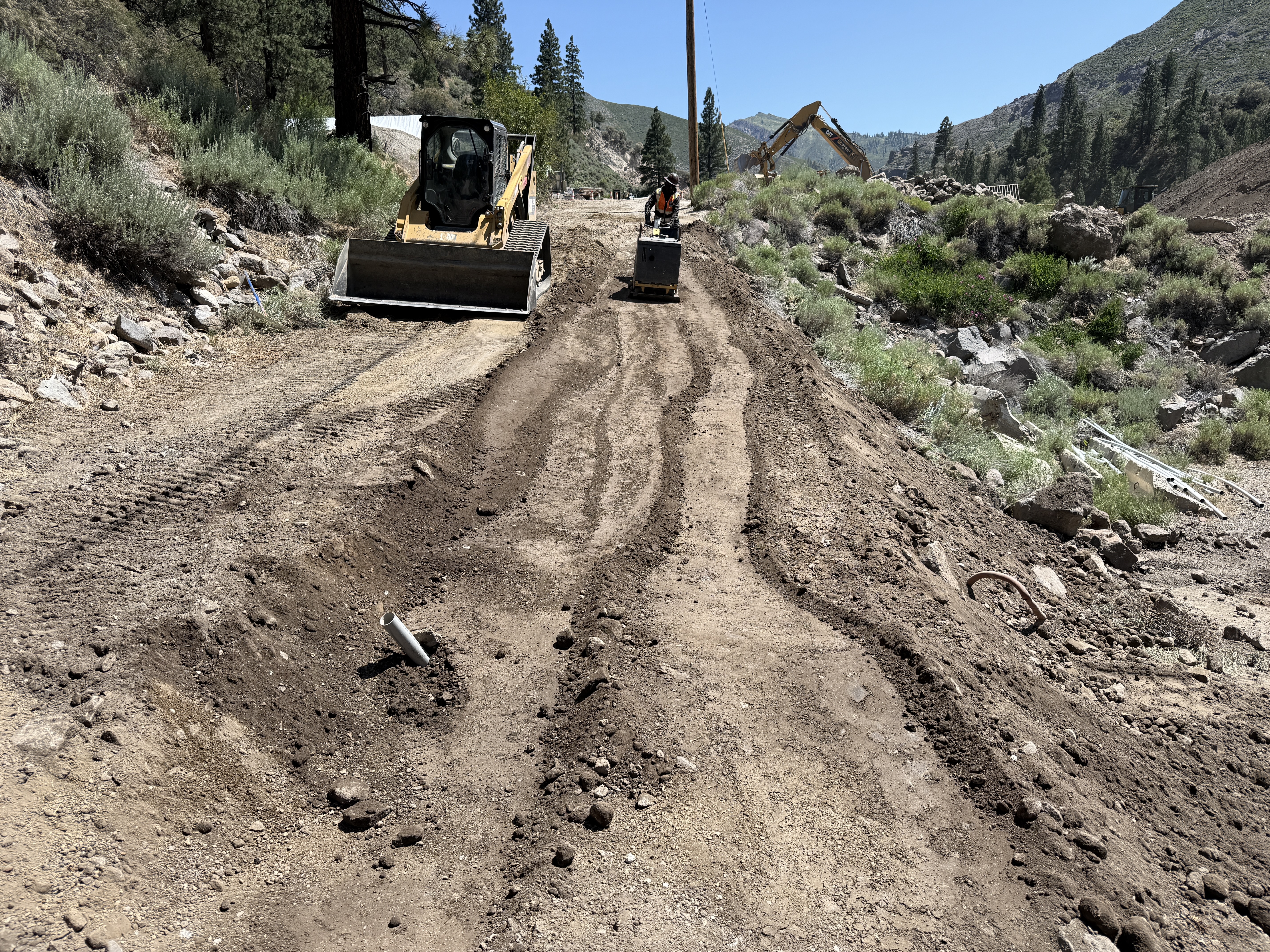 A bulldozer and a roller are present on a dirt path alongside rough terrain. The path shows signs of active grading, with visible track marks. A construction worker in PPE operates the roller. Vegetation and rocks are present alongside the path.
