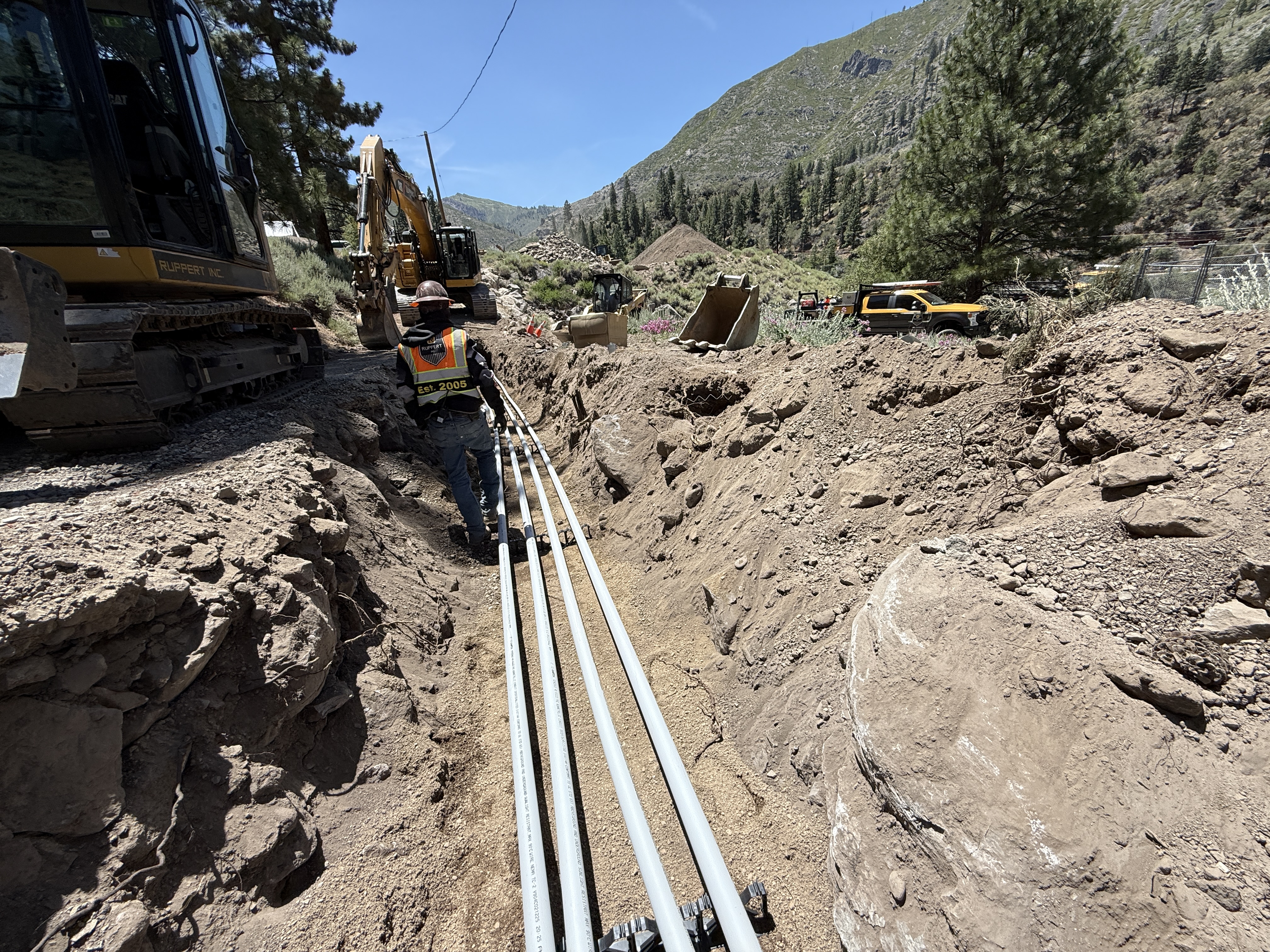 The image shows a construction site where pipeline installation is taking place. A construction worker is positioning conduits in a trench alongside the bank. The scene includes two excavators, one stationed to the left and another active in the background. Additional construction vehicles and equipment are present in the background among trees and uneven terrain.