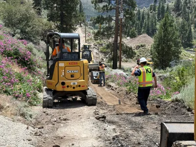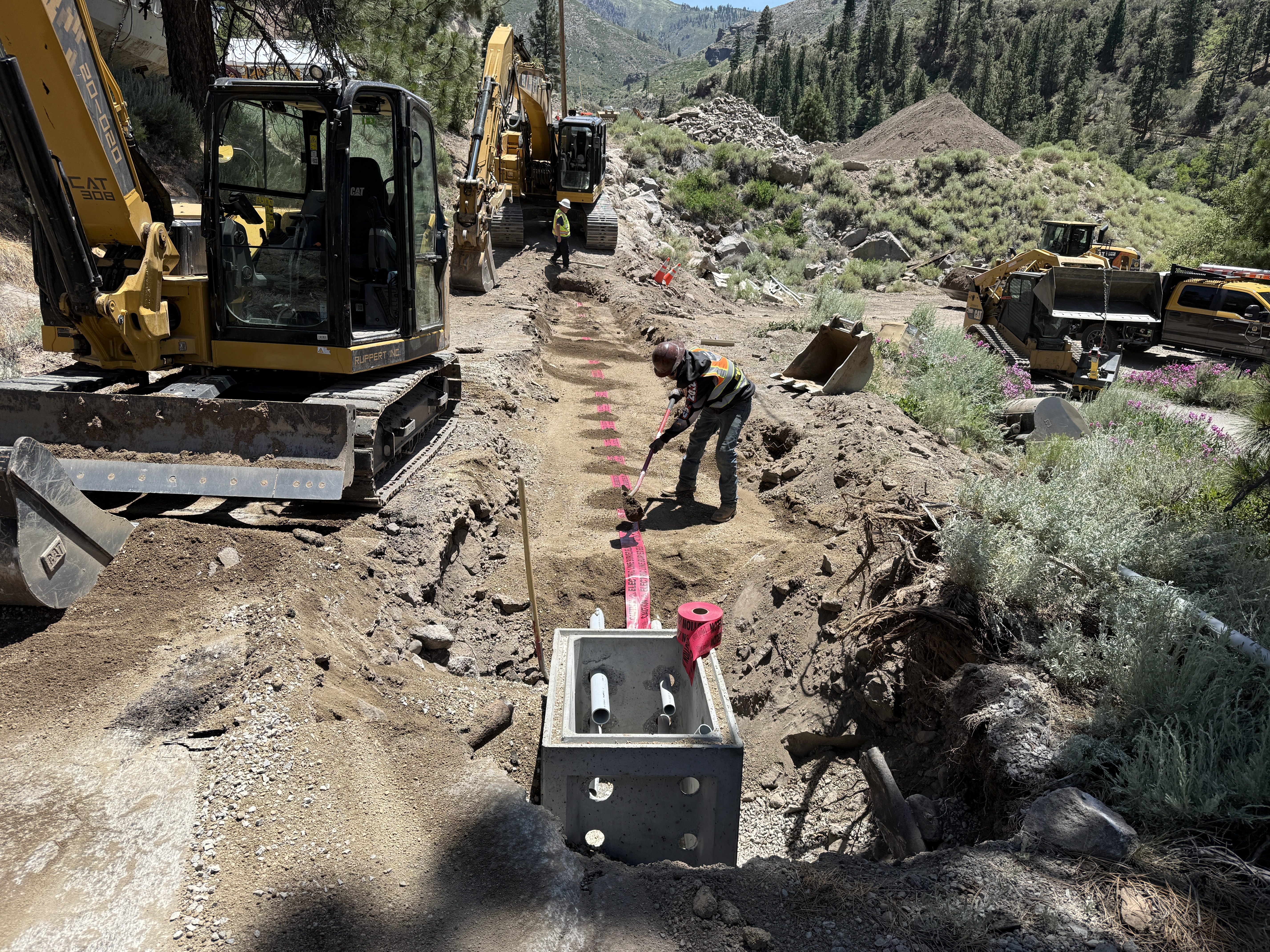 The image shows trenching work with excavators positioned along a trench. A worker is shoveling along a marked path next to the trench. A concrete duct bank component with pipes is partially installed in the trench. The scene includes dirt piles, and a dirt road runs parallel to the trenching area.