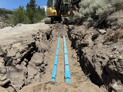 The image shows a tracked excavator stationed partially on a dirt road with several orange traffic cones placed around it as a safety measure. The background shows a sloped area with vegetation, indicating the location is in a hilly or mountainous terrain. No active trenching or construction work is visible, suggesting the machinery might be staged for future use.
