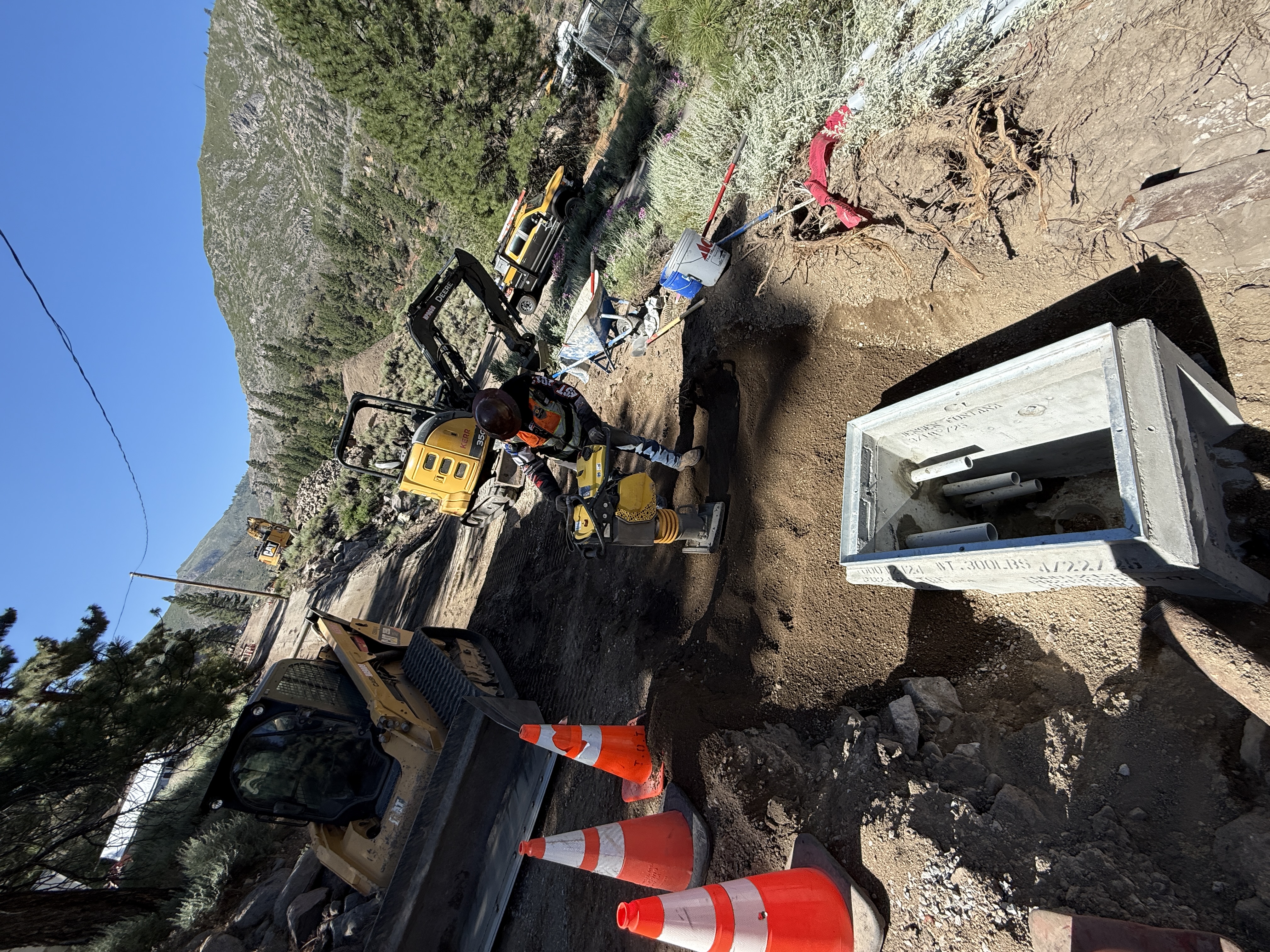 The image shows a construction worker using a compaction tool on a dirt surface near a concrete utility box. Multiple pieces of construction equipment including excavators and loaders are visible in the background. Orange safety cones are placed around the area. The terrain is uneven and set against a backdrop of trees and mountains.