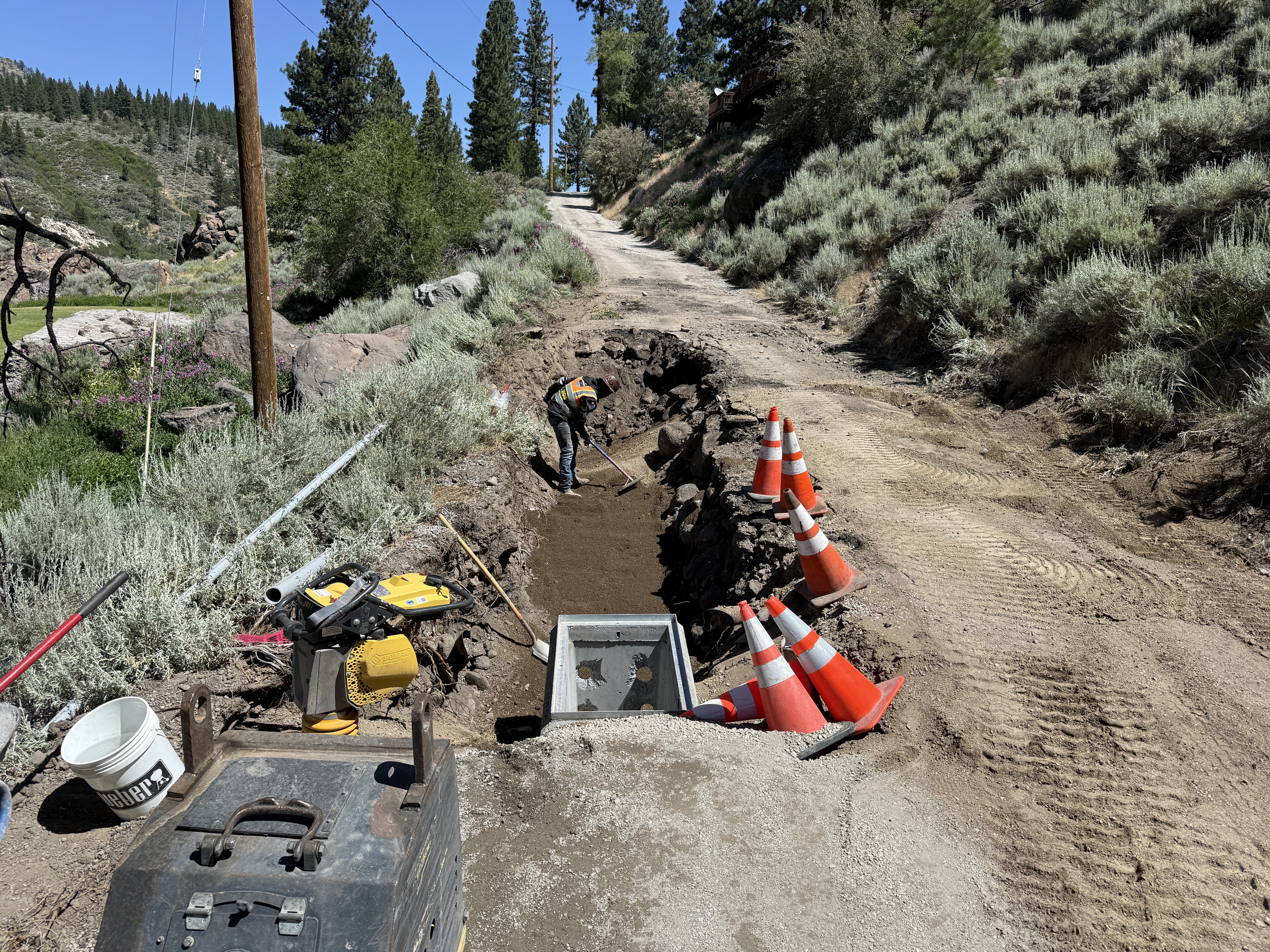 A trench is being actively worked on the side of a dirt road. A worker is raking or leveling soil inside the trench, which is lined by traffic cones for safety. A concrete utility box is visible in the trench, suggesting utility work. Various tools and a piece of compacting equipment are positioned nearby.