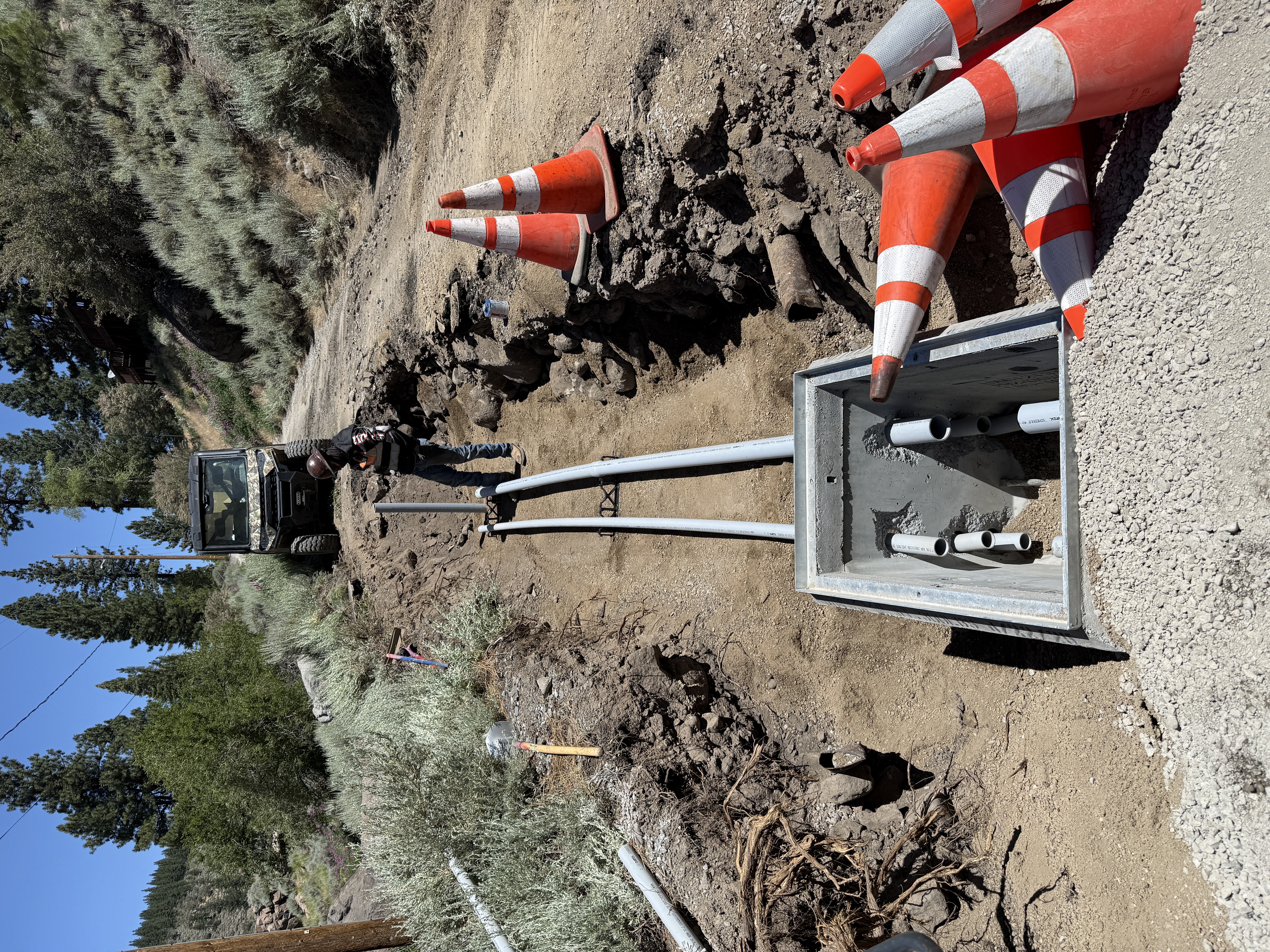 A worker is present in an open trench, where plastic conduits are installed. Trench boxes are visible, and traffic cones are placed around the site for safety. A utility vehicle is stationed nearby. The work area seems actively engaged in trenching, with conduit's pathway partially covered with soil.