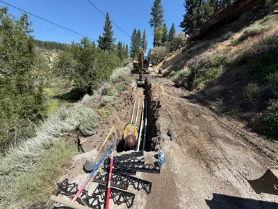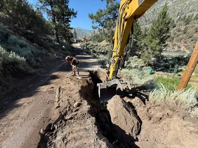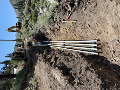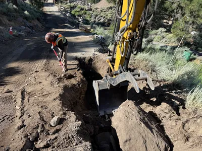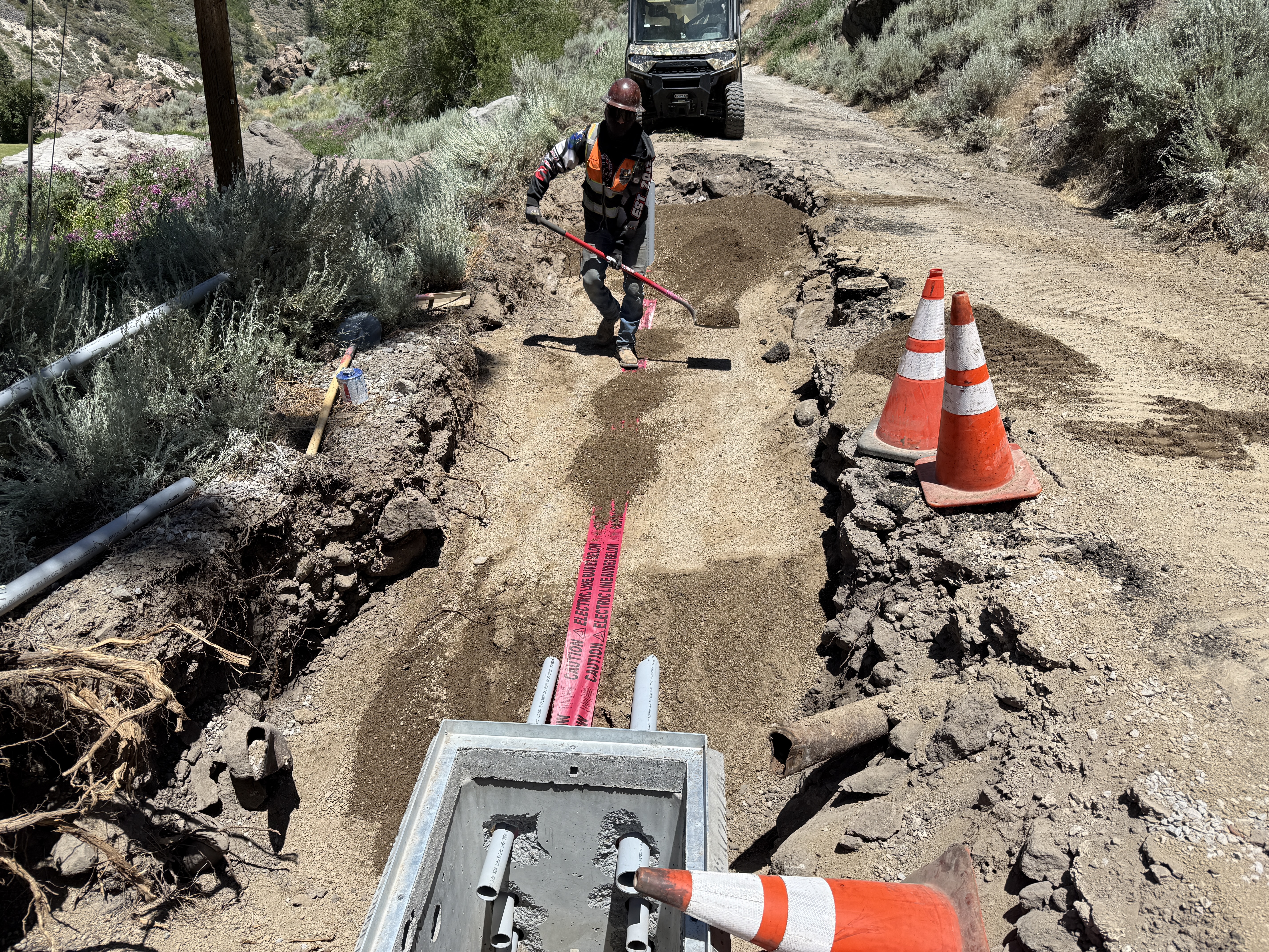 A person is spreading backfill material into a trench using a shovel. Several orange safety cones are placed along the trench. A conduit box with pipes is visible at the bottom of the image. Pink caution tape marks the location, indicating underground hazards. The surrounding terrain is dirt and rocky with some vegetation.
