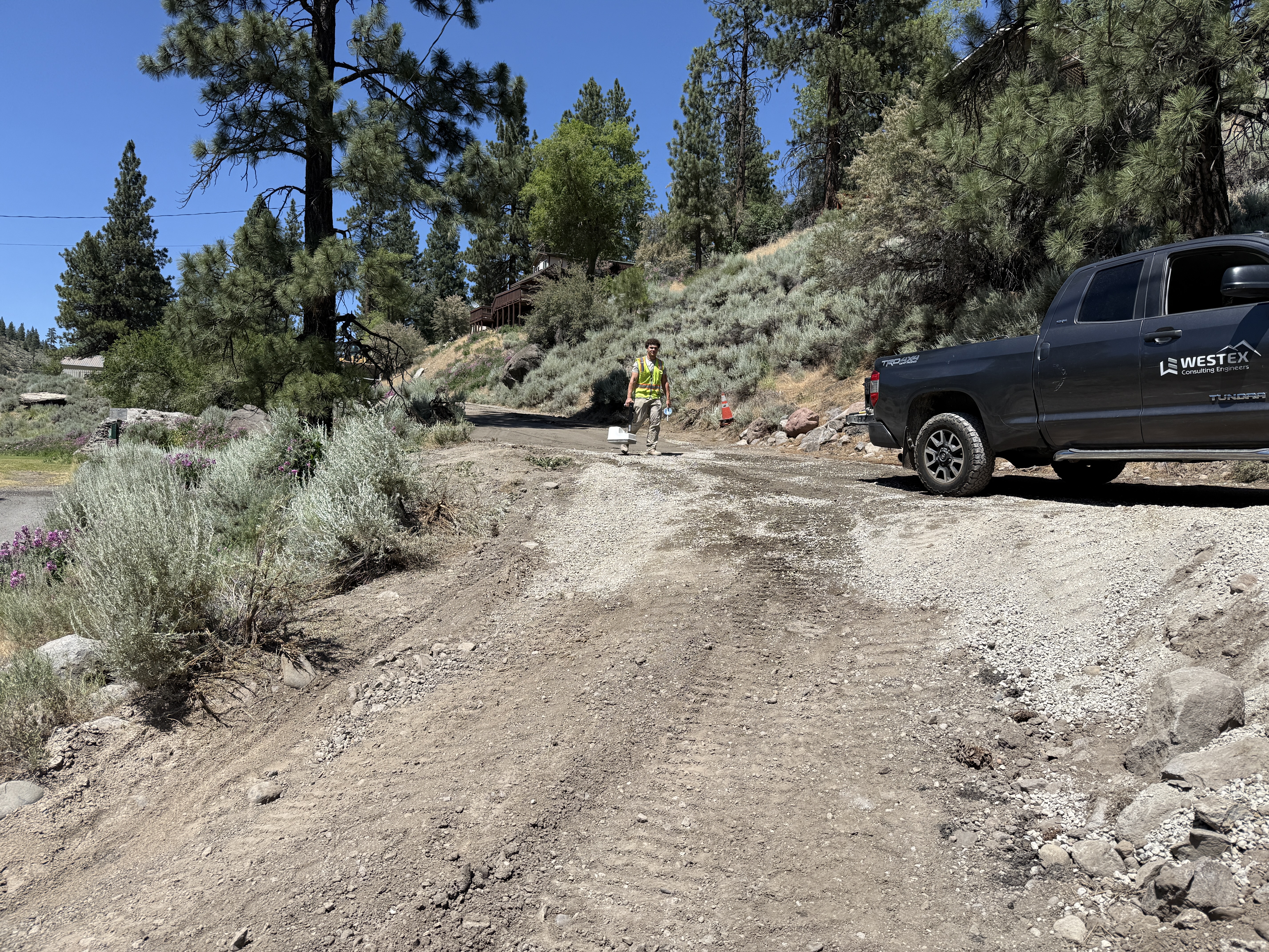 A construction worker wearing a hi-vis vest walks on a dirt path amid vegetation, indicating active site-grading. A pickup truck marked with 'Western' is parked nearby. The area is surrounded by trees and the terrain shows evidence of recent grading activity. Traffic cones are visible in the area, suggesting caution around uneven ground.