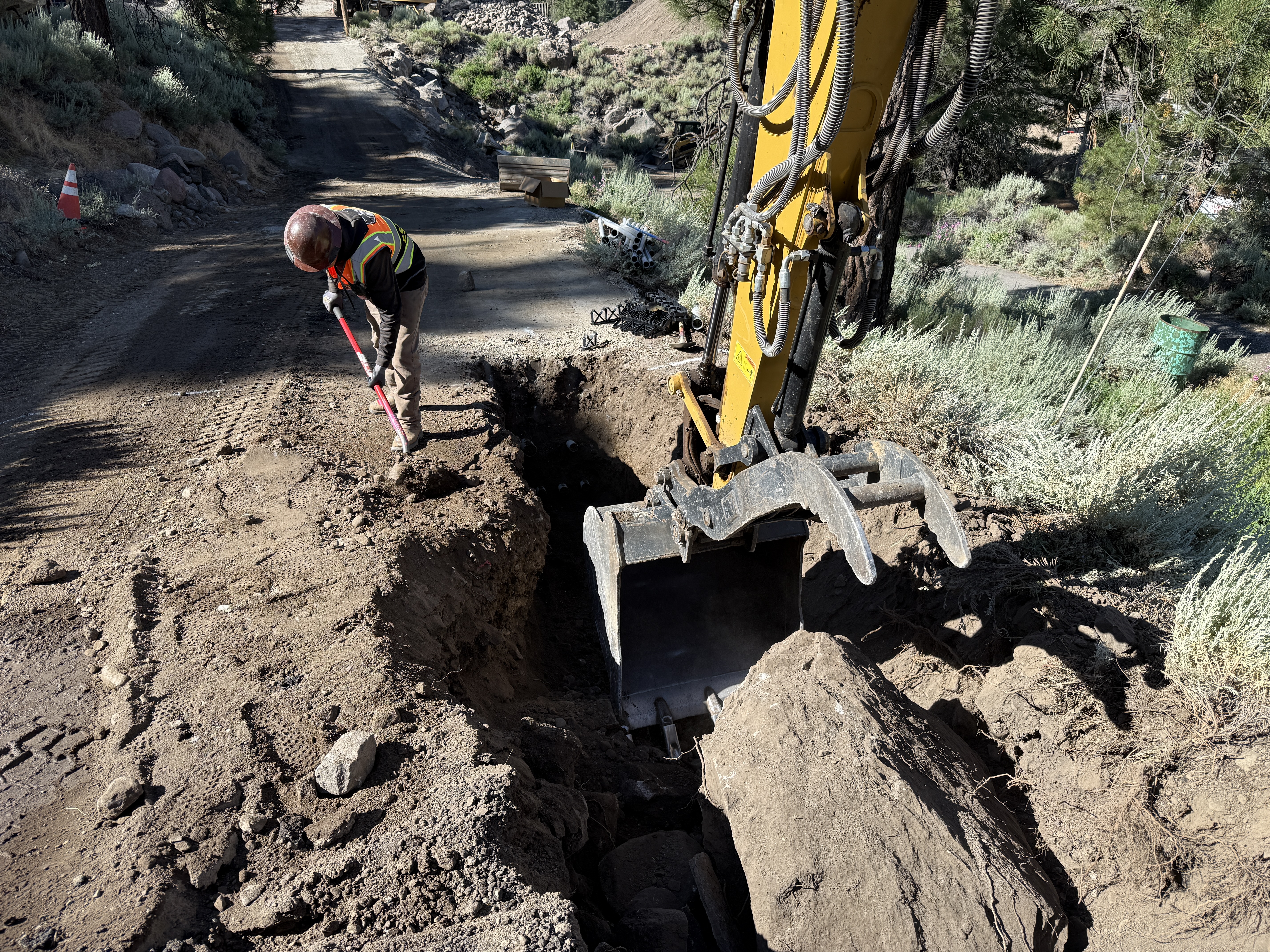 The image shows a worker with a red shovel digging a trench alongside a yellow excavator. The worker is on the left side of the image while the excavator is on the right, positioned along a dirt road. The area is surrounded by vegetation, and a large rock is visible in the trench. The scene suggests ongoing trenching operations.