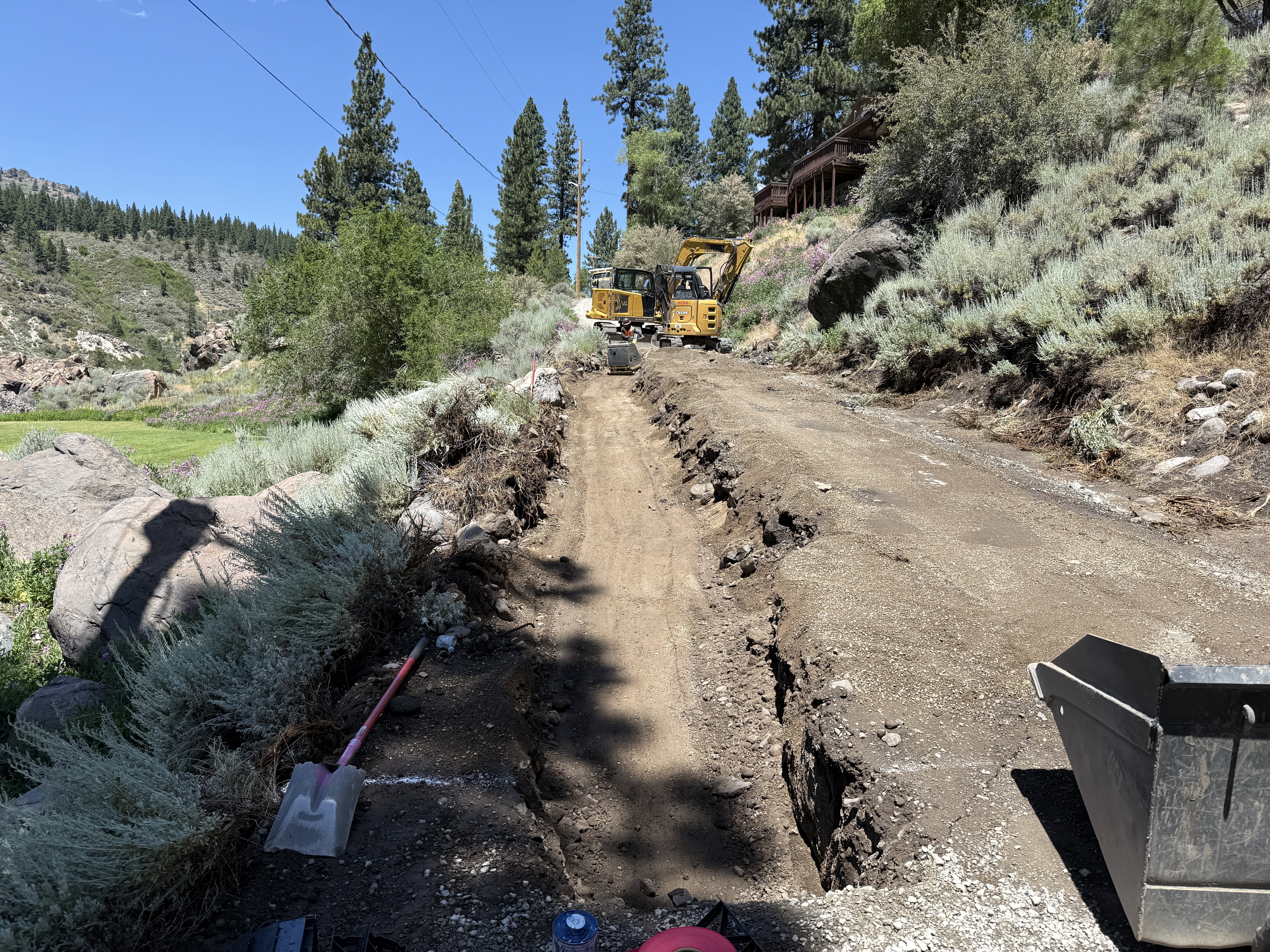 The image shows trenching work on a dirt road with an excavator positioned midway up the road. There is a trench along the right side, with a shovel and other tools placed nearby. The area is surrounded by vegetation, and no safety barriers are visible.