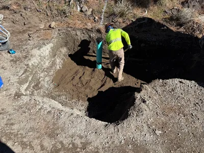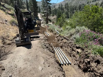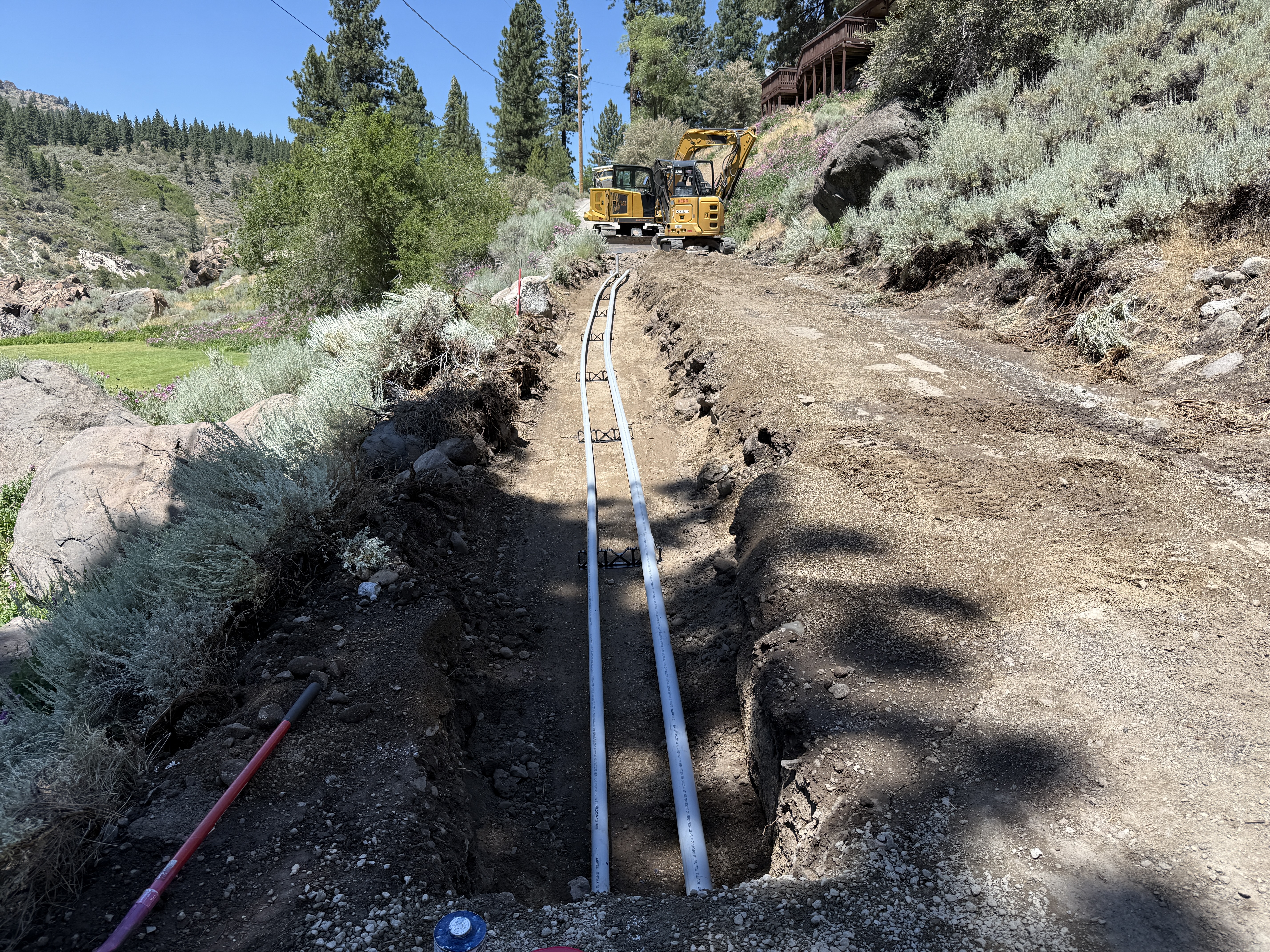 The image shows a trench along an unpaved road with two pipes laid inside. An excavator is visible in the background on the dirt path. The environment is mountainous, with natural vegetation along the trench. This likely indicates ongoing trenching work, with some site preparation evident.