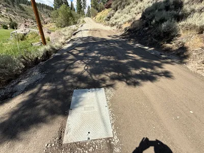 The image shows a trench being dug alongside a dirt road, with an excavator positioned on the road. Pink caution tape is placed alongside the trench. The landscape features trees, scrub vegetation, and a nearby rock formation. One worker is visible in the distance, and the weather appears clear.