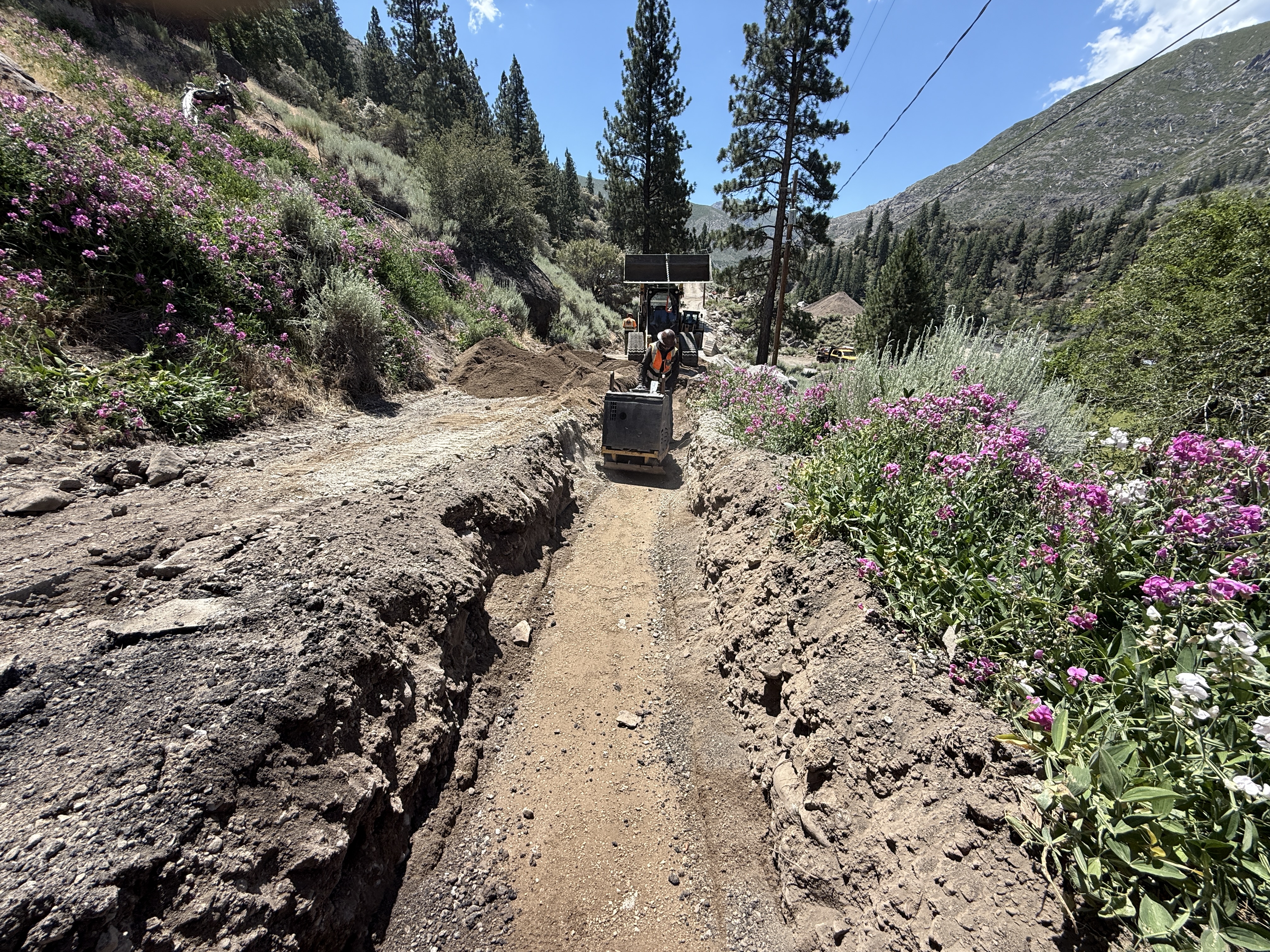 The image shows an open trench in a natural terrain with a skid steer loader positioned on the trench path. The operator appears to be using the loader to move soil or materials. The surrounding area is covered with vegetation, and there are pink flowers alongside the trench. Overhead power lines can also be seen in the image.