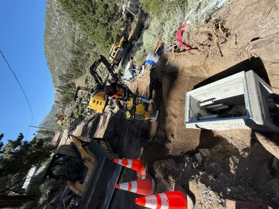 The image depicts a rough gravel road that curves through a hilly, vegetated environment. On the right, there is a slope covered with bushes and taller trees. A wooden structure, possibly a house or cabin, is partially visible above the slope. No construction activity is visibly taking place, and no equipment or materials are present.
