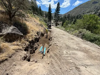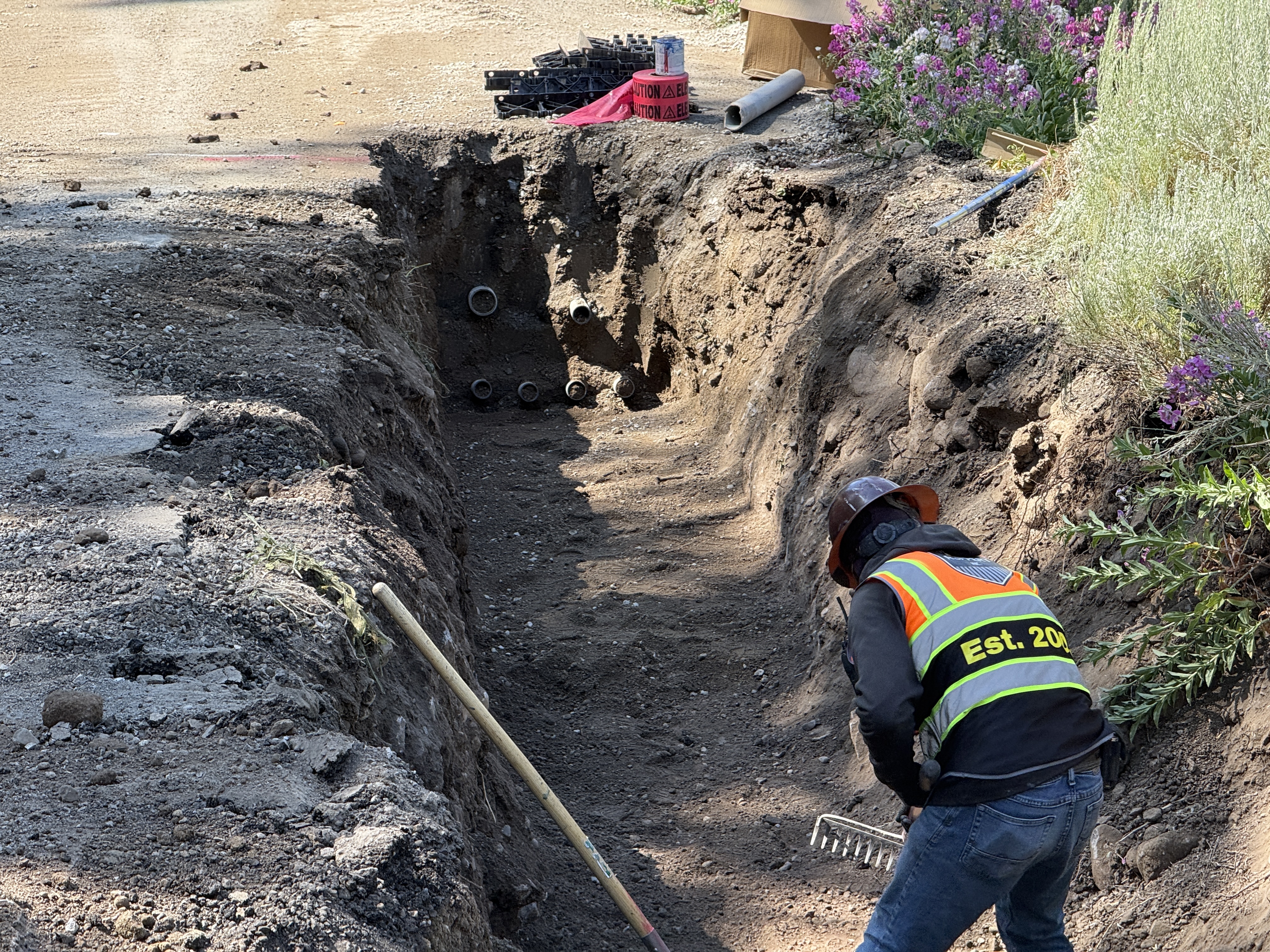 The image shows a trench with a worker dressed in PPE, raking the soil. Multiple pipes are visible protruding from the trench wall. The area has dirt and some vegetation nearby, and the worker is wearing a high-visibility vest and a hard hat.