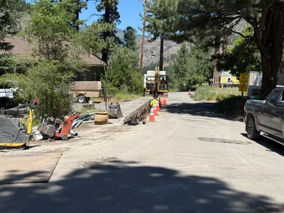 Viewed is an open trench running parallel to a dirt road with several metal pipes laid inside. A bulldozer with a load of soil is positioned at the top end of the trench. The surrounding area includes dirt and scattered vegetation, with a background of trees and hills. The scene suggests ongoing trenching work with potential pipeline installation but lacks detailed context.