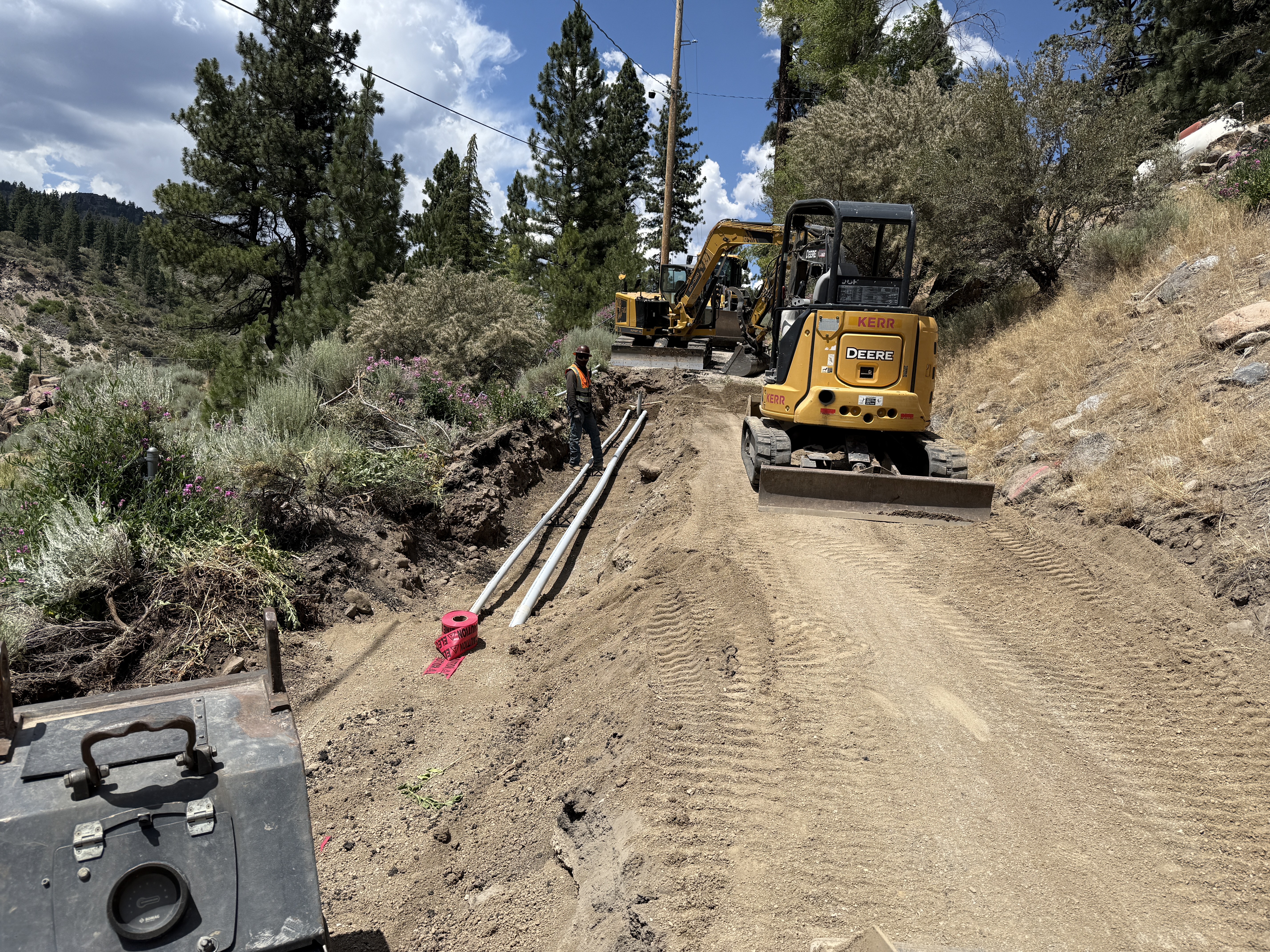 The image shows trenching activity on a dirt path with visible piping on the left side of the trench. Two excavators are positioned on the path, with one near the foreground and another further down the path. A worker wearing safety gear stands near the trench and pipes. The environment is a sloped terrain with vegetation along the sides.