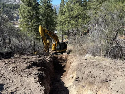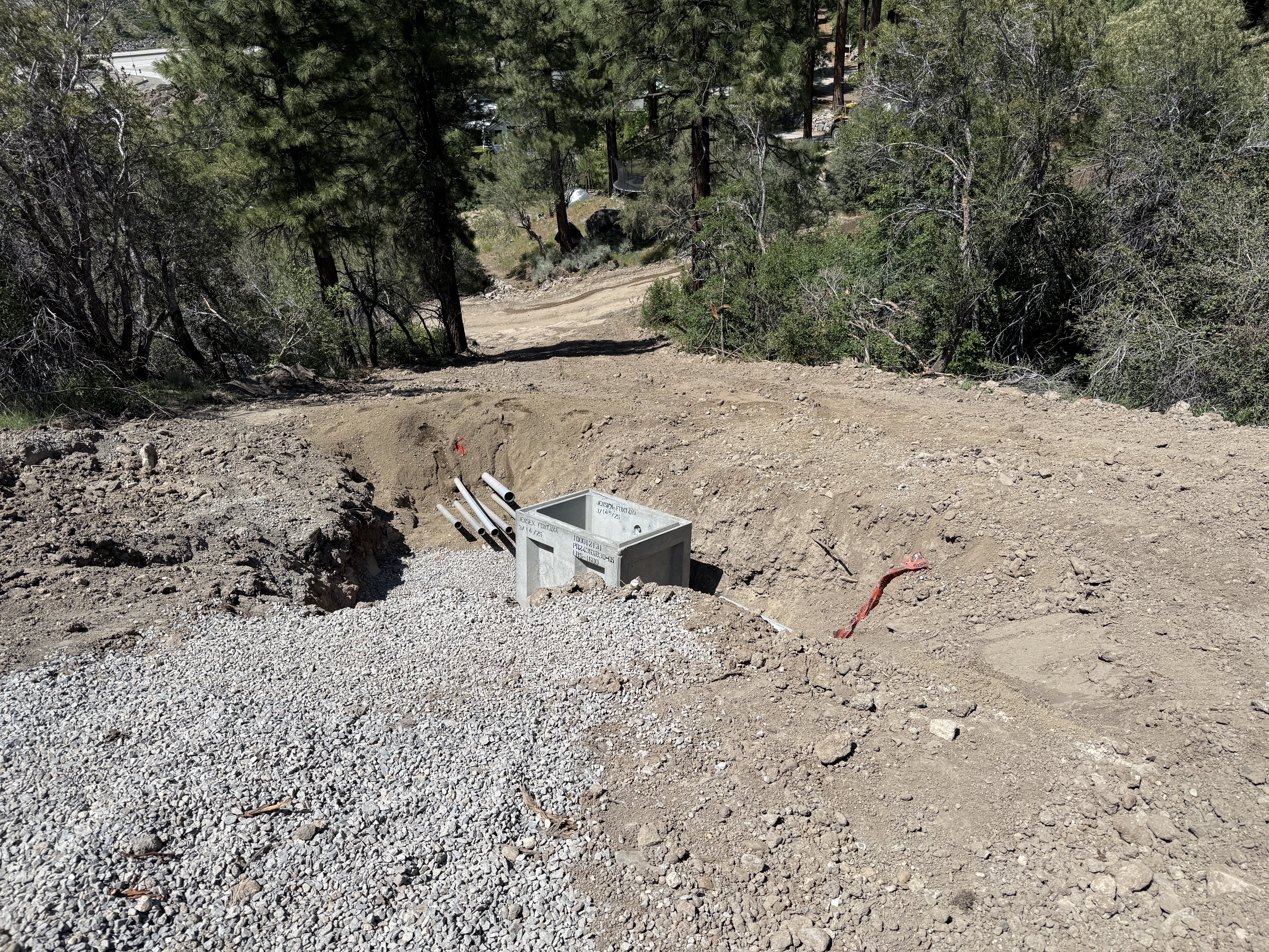 The image shows an open trench with an exposed duct bank containing several conduits. A utility box is installed within the trench. Surrounding the area is loose dirt and some gravel, indicating recent excavation or ongoing work. There is no presence of construction workers or equipment actively operating on site.