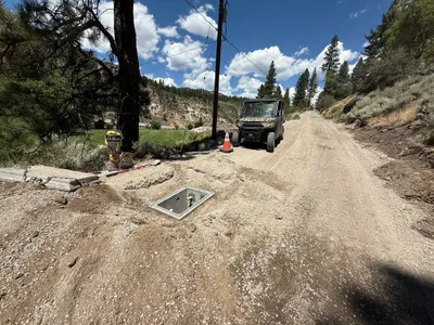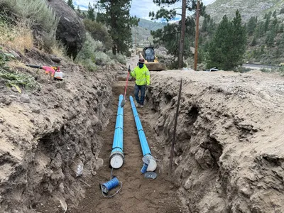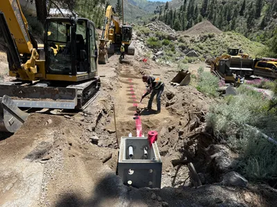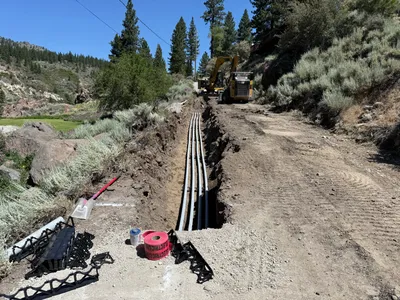 An open trench is visible running along a hillside with numerous conduits laid within. Heavy equipment is seen nearby, suggesting ongoing or recent trenching work. The trench is in a rural or forested area, partially surrounded by vegetation. Soil and rocks are displaced along the trench edges, indicating recent excavation.