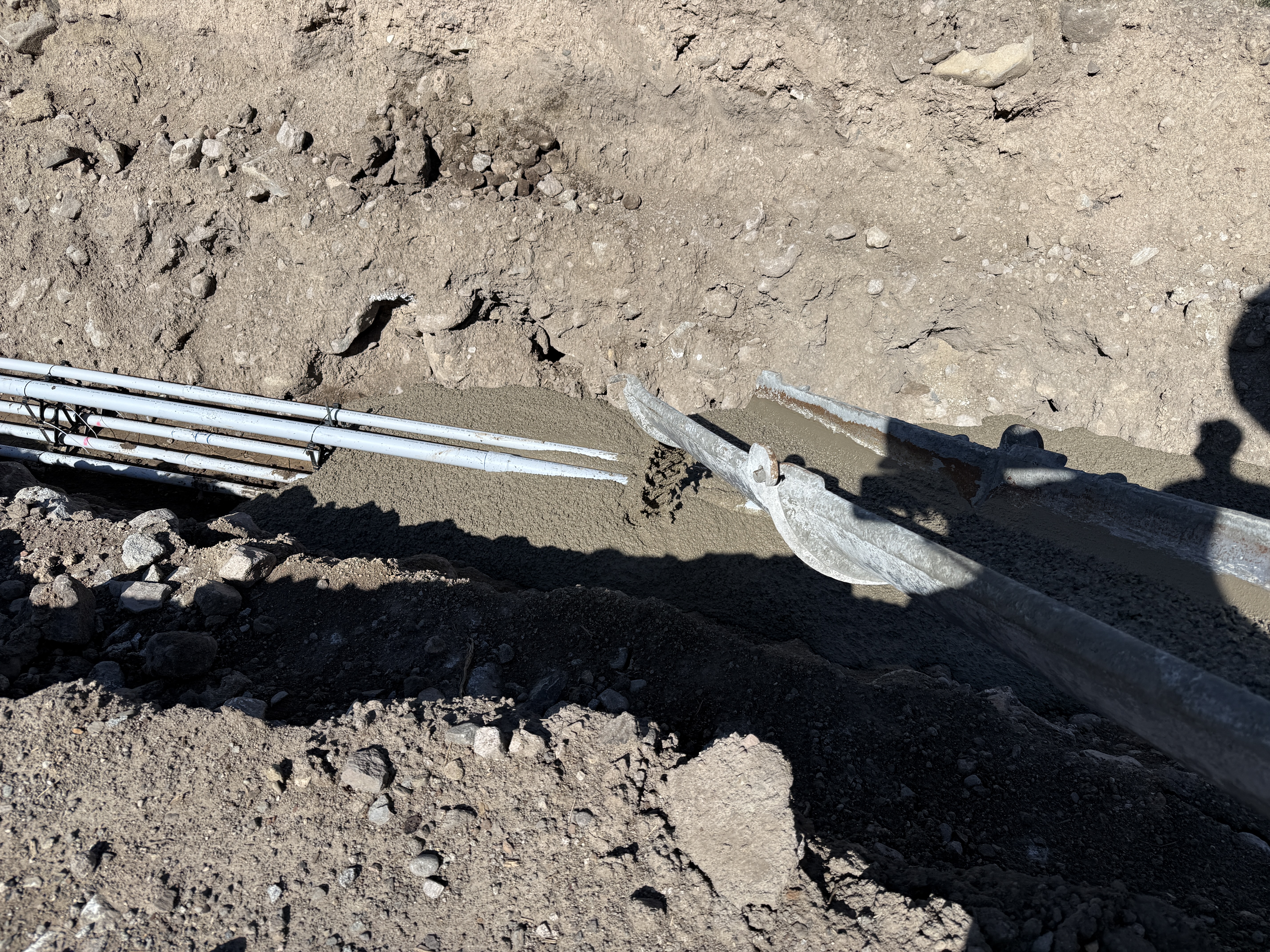 The image shows a trench with multiple conduits or pipes exposed. Freshly poured concrete is being placed around these conduits, with evidence of a concrete slide in use. Shadows from nearby personnel are also visible, indicating active work occurring. The ground consists of loose soil with some rocks scattered around the trench area.