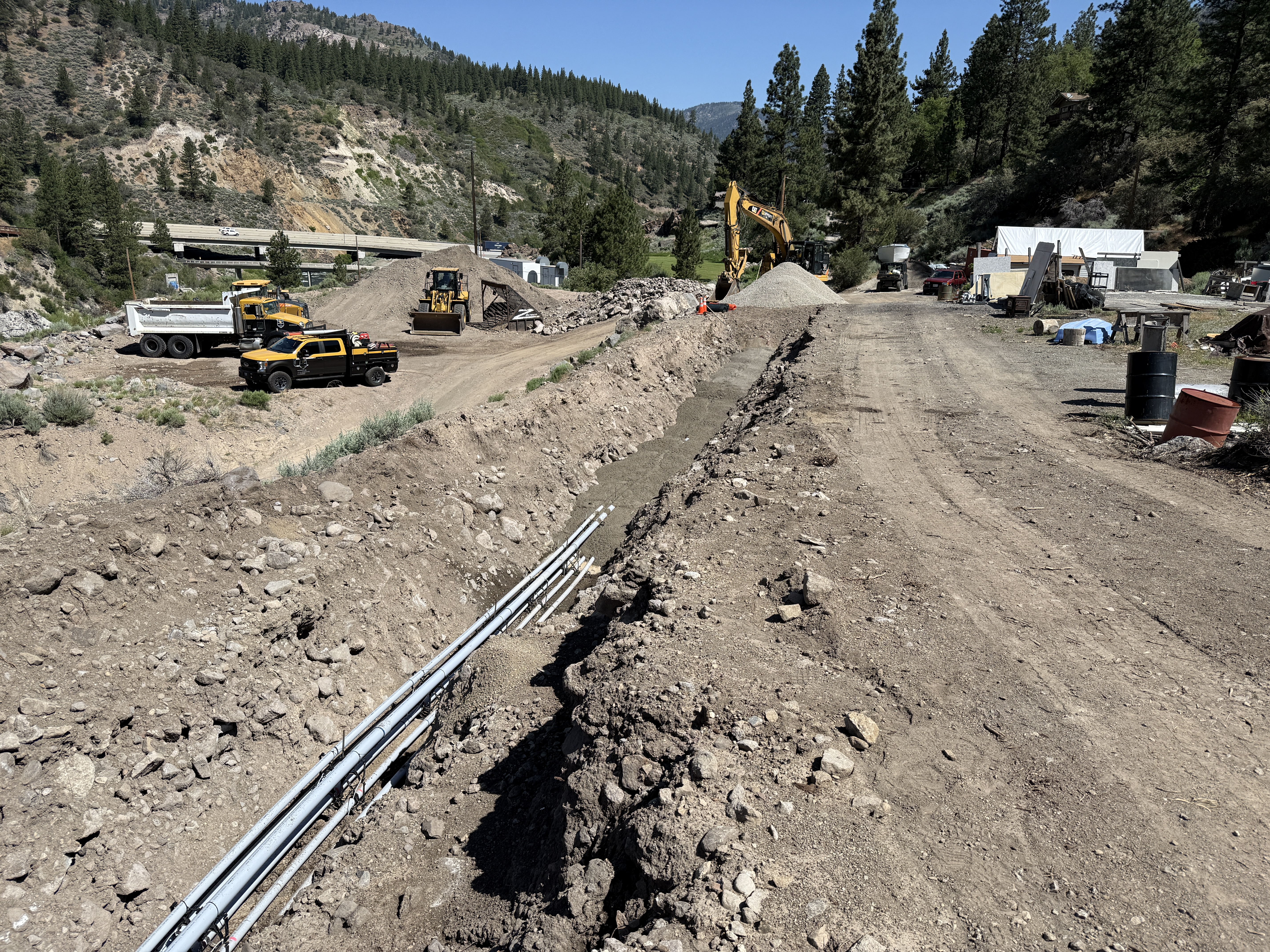 dirt and gravel with an open trench clear and sunny accessible with some space for staging equipment