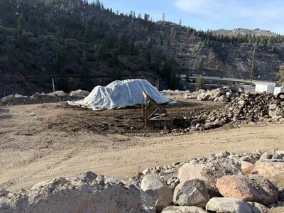 A worker is operating a concrete hose to pour concrete into a trench, likely for a duct bank. The trench is cut through rocky soil alongside a dirt road, with a concrete mixer truck positioned nearby. An excavator is visible in the background, suggesting recent or ongoing excavation work. The area is in a mountainous region, as evidenced by the surrounding landscape.