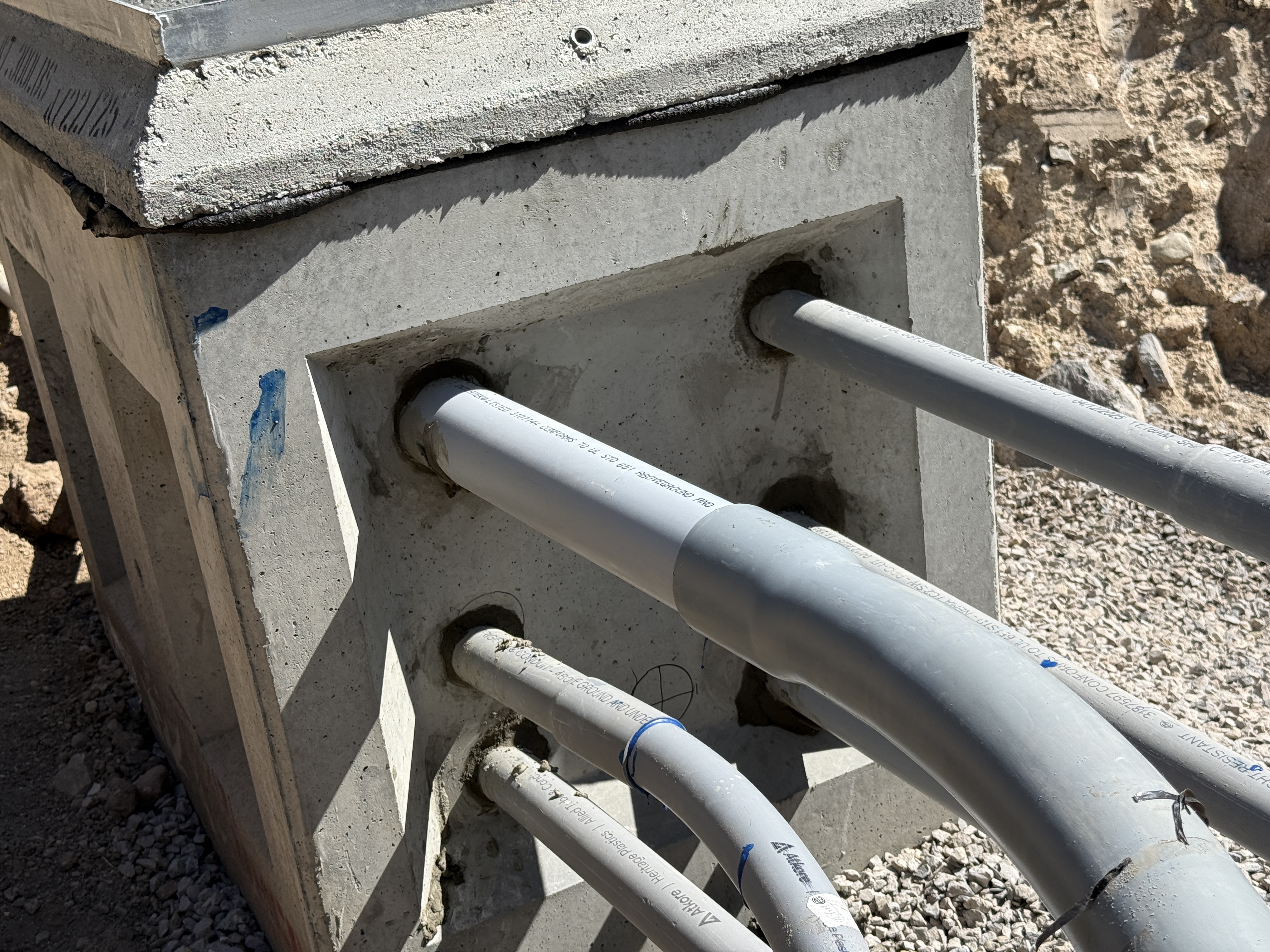 The image shows a section of a concrete structure with several electrical conduits inserted into it. The conduits appear to be installed horizontally, penetrating the side of the structure. The surrounding area has gravel and dirt, indicating ongoing site work. The structure seems part of a duct bank installation related to a finished water tank.