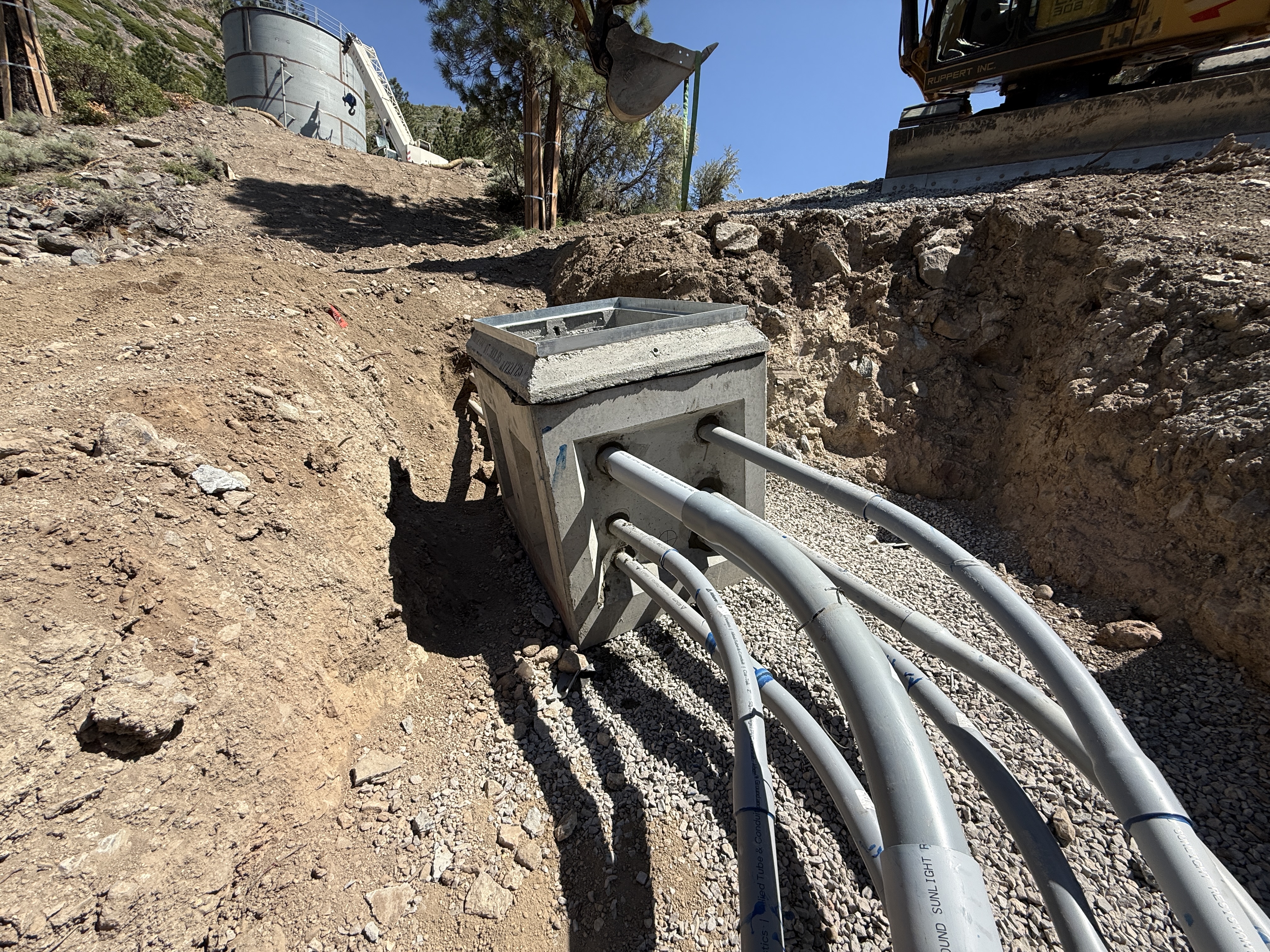 The image captures a construction site where several conduits are running into a concrete duct bank situated in an open trench. The trench appears to be freshly dug, with uneven soil and gravel surrounding the area. There is heavy machinery positioned uphill, potentially involved in excavation or backfill activities. No workers or additional equipment are clearly visible.