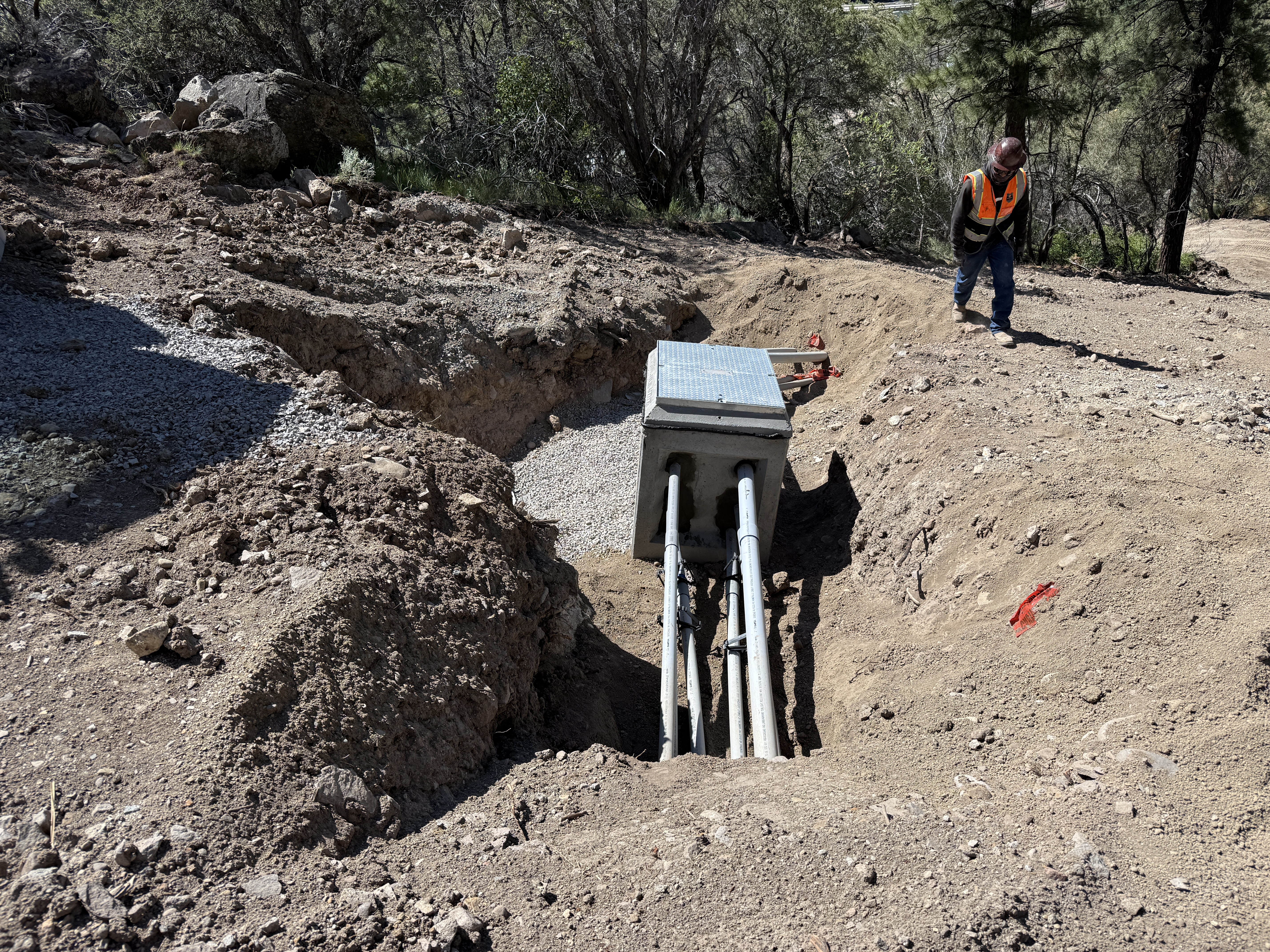 The image shows a trench with a utility box partially buried in the ground. Multiple conduits are connected to the utility box, extending into the trench. A worker in a hard hat, hi-vis vest, and work boots is present near the trench. The surrounding area consists of rocky soil with some small trees in the background.