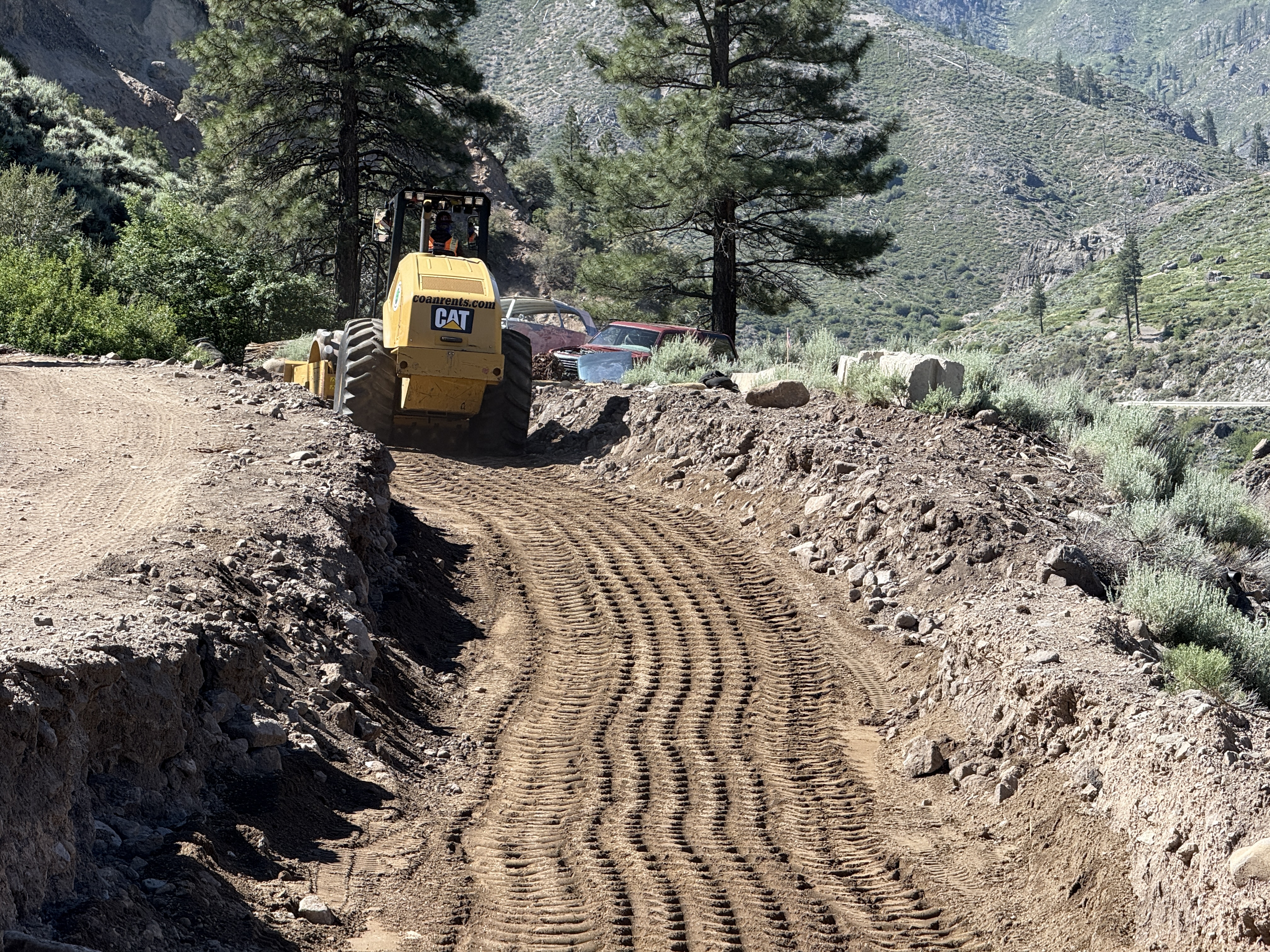 The image shows a site-grading operation where a compactor is working on a dirt path. The compactor is on a newly graded surface, evident from the visible tire tracks. The surrounding area includes trees and rocky ground with some shrubs. The scene indicates active grading work on a sloped terrain. There are no visible barriers or additional materials staged nearby.
