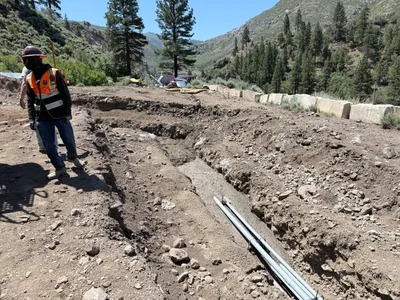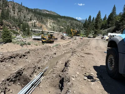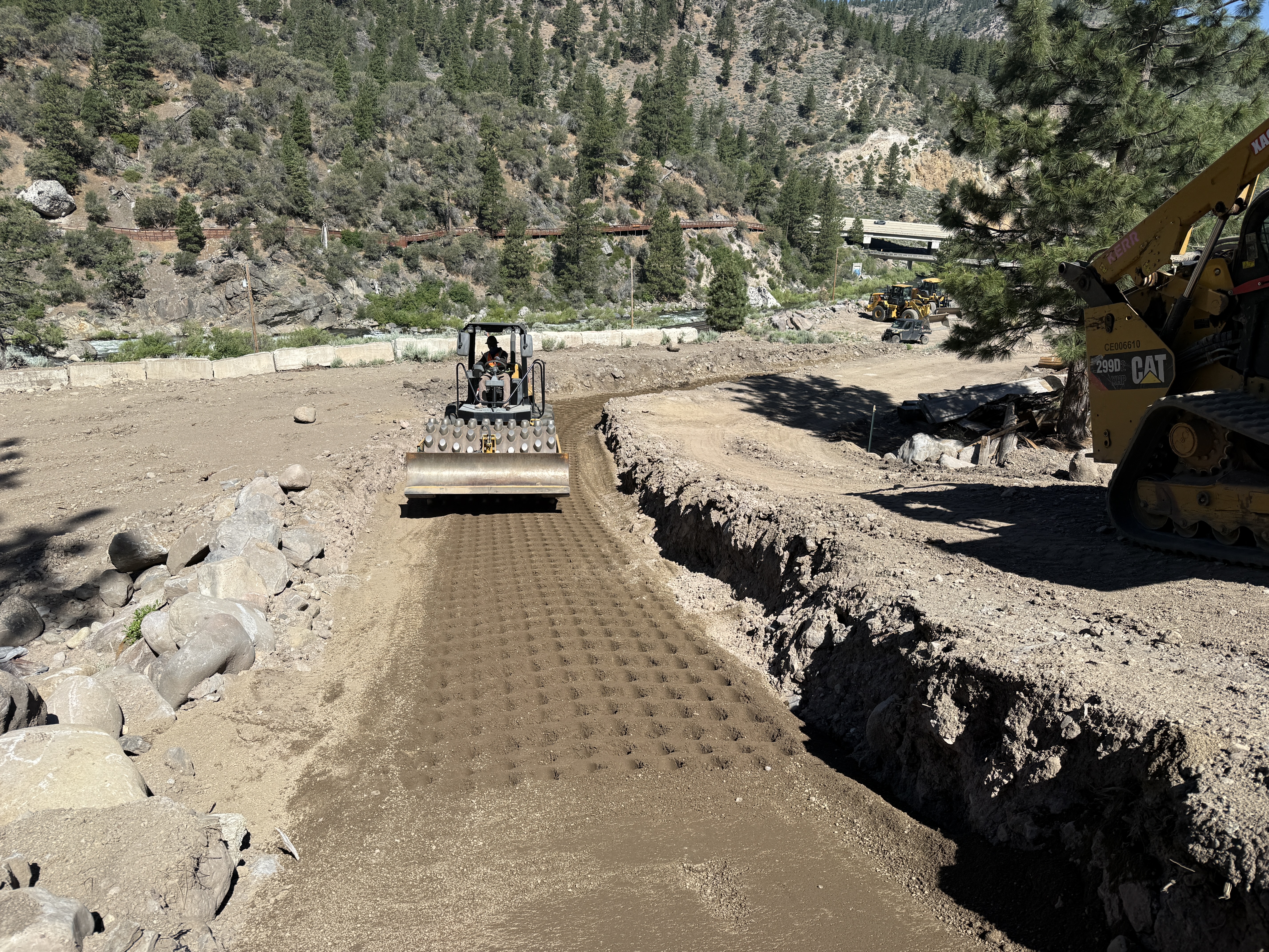 The image shows a roller compactor operating on a dirt path, creating a patterned imprint on the soil. A worker is operating the equipment, compacting the ground for stability or surface preparation. Nearby, a CAT piece of heavy machinery is parked, indicating continued site work. The area is surrounded by a natural landscape of hills and trees, and scattered rocks are present alongside the path.