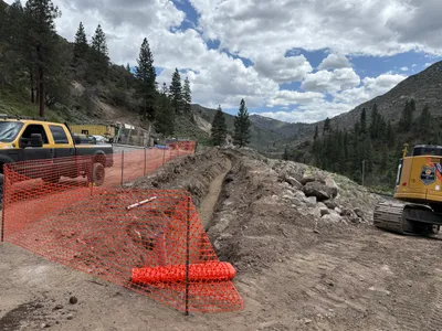 The image shows a trenching operation along a dirt path with visible excavator tracks and some pink markers on the ground. There is an excavator on the left side, parked near a collection of containers and materials. The area is surrounded by a hilly landscape, with sparse vegetation visible on the right. No visible piping or other installation components are in place at this stage.