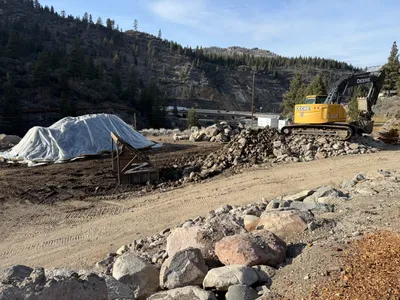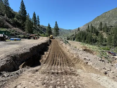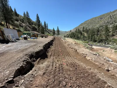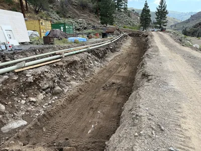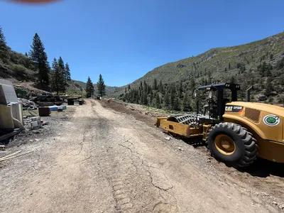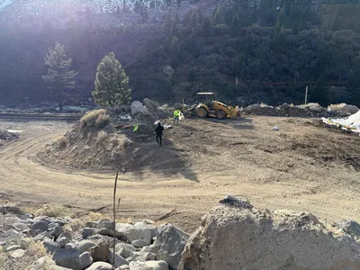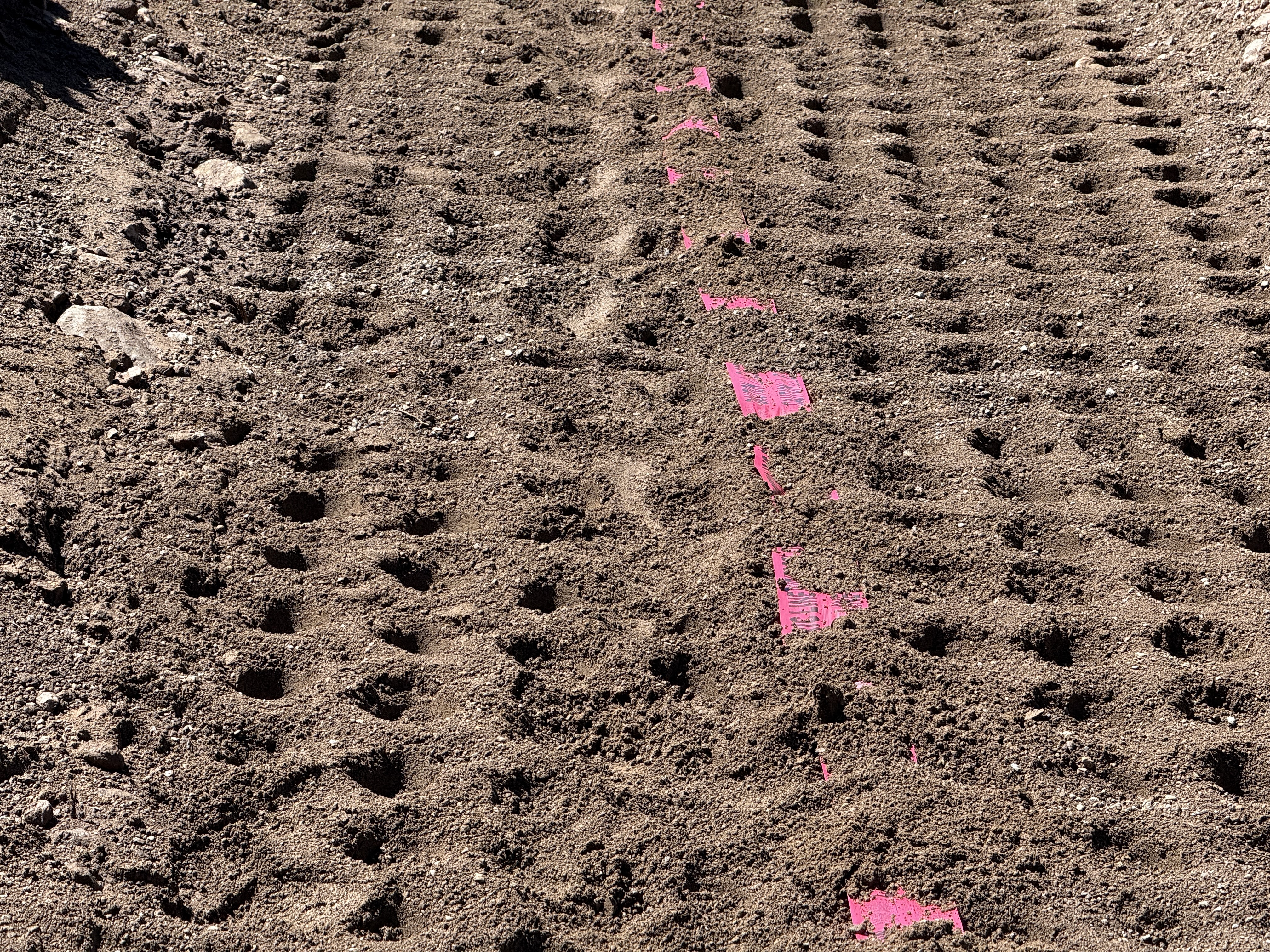 The image shows a dirt area with numerous tire or track marks suggesting recent vehicle activity. There are pink markers placed along a linear path across the soil surface. The presence of these markers may indicate preparatory work, but the exact purpose is not visible.